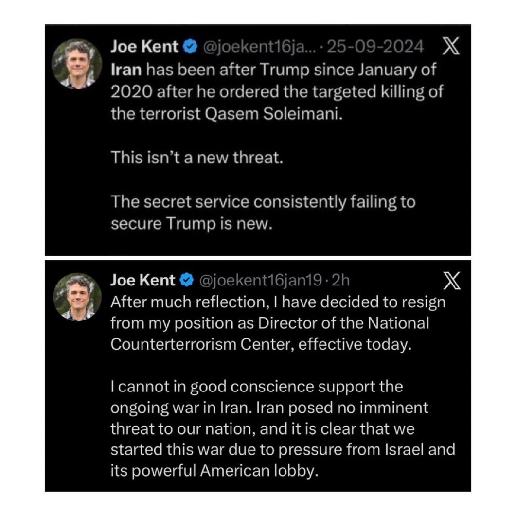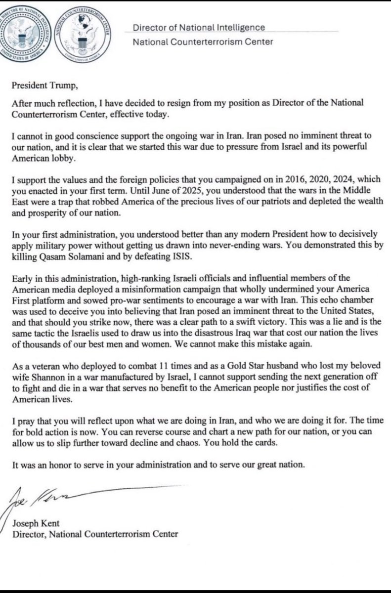 After much reflection, I have decided to resign from my position as Director of the National Counterterrorism Center, effective today. I cannot in good conscience support the ongoing war in Iran. Iran posed no imminent threat to our nation, and it is clear that we started this war due to pressure from Israel and its powerful American lobby. It has been an honor serving under @POTUS and @DNIGabbard and leading the professionals at NCTC. May God bless America.