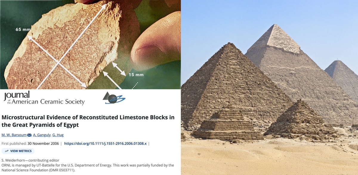 In 2006, the Journal of the American Ceramic Society published research by M. W. Barsoum and colleagues showing micro-structural evidence of reconstituted limestone blocks in the Great Pyramids. Scanning and transmission electron microscopy revealed micro-constituents with appreciable amounts of silicon in ratios that do not exist in any natural limestone sources near the pyramids. Submicron silica-based spheres in the samples strongly suggest the material was formed from a basic solution, consistent with Joseph Davidovits' Geopolymer Hypothesis that at least some pyramid blocks were cast in situ from a limestone aggregate concrete, rather than quarried and transported as monolithic blocks