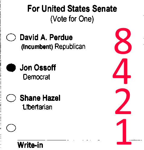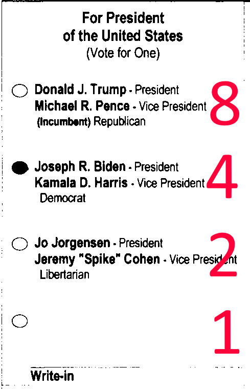 For binary challenged 0001 = 1 = Write In 0010 = 2 = Joe Jorgensen 0100 = 4 = Joseph Biden 1000 = 8 = Donald Trump "There are 10 kinds of people, those who understand binary, and those who don't"