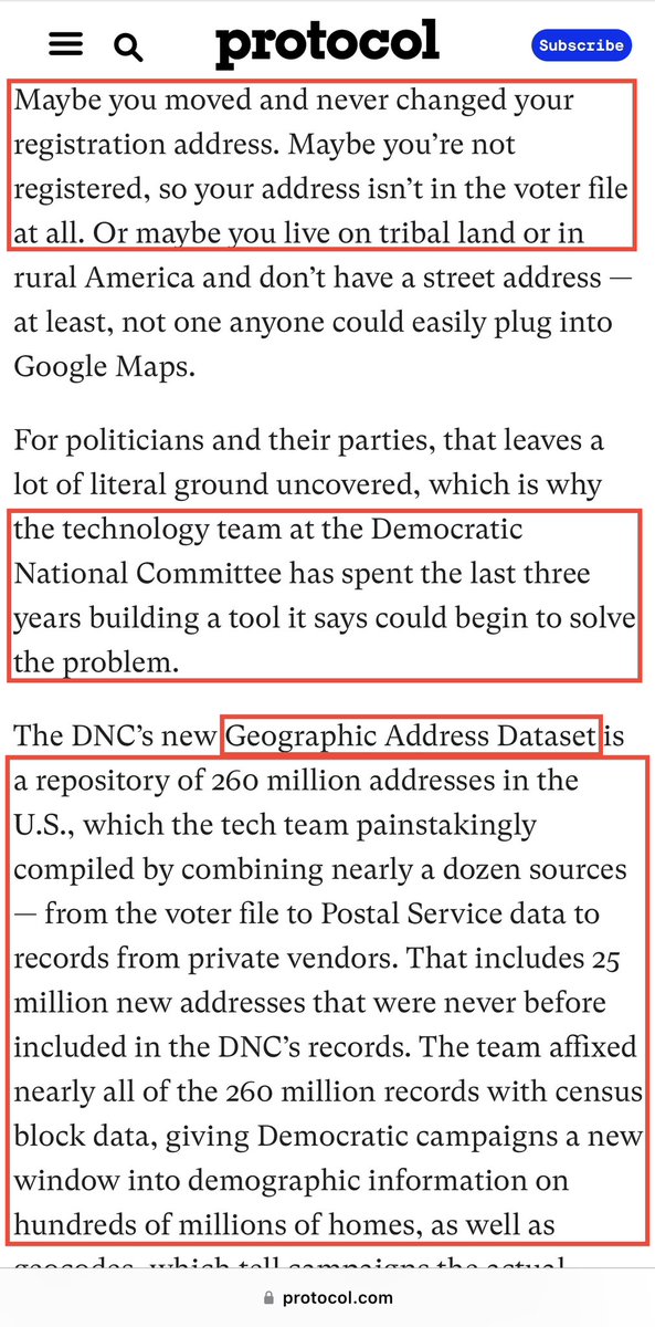 “The DNC has a new secret weapon for finding voters…” 💥That ‘weapon’ is called the “Geographic Address Dataset”. It focuses on PHYSICAL ADDRESSES instead of ACTUAL HUMANS, and has resulted in a 10-11% INCREASE IN “DEMOCRAT TURNOUT” in recent elections. Yeah, it’s a REPOSITORY of 260,000,000 ADDRESSES they’ve gained access to, largely in collusion with the USPS (Amber McReynolds) and other 3rd party vendors (ERIC/AVID/Konnech/BPro/etc. are the most likely). Imagine that.🤬 💥Gosh, that’s so weird… that 10-11% INCREASED DEMOCRAT TURNOUT FIGURE closely matches with consistent VOTER ROLL INACCURACY FIGURES discovered by current and former ERIC MEMBER STATES within their voter rolls upon conducting internal investigations of the ERIC voter registration system. 🤬🤬🤬🤬🤬🤬🤬🤬🤬🤬🤬🤬🤬🤬🤬 (You don’t have enough contempt for these people yet.)
