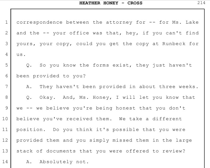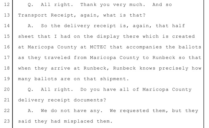 Honey's http://VerityVote.org was finally allowed to view (photocopies of) 55 of "those forms" at Maricopa County *six months after* they were requested ahead of trial - at which time Maricopa claimed that their Delivery Receipt copies were "misplaced," per Honey at Page 213: