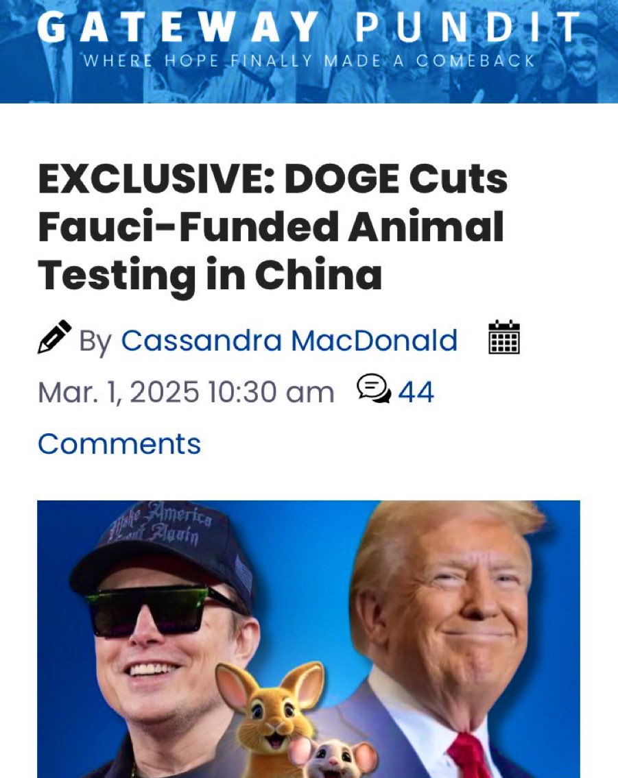 Patriots, the awakening is NOW. DOGE, led by Elon, just SHUT DOWN Fauci’s twisted animal testing in China—EXPOSED by Gateway Pundit. This isn’t just a win for the voiceless, it’s a death blow to the deep state’s bioweapon agenda. Trump and DOGE are bringing REAL JOY, while voices like Alex Jones, Liz Churchill, and Antonio Sabato Jr. scream the truth the MSM buries. But Fauci? He’s still free, a puppet of the elites, hiding crimes that could bring down their empire. We SEE the patterns—China ties, patents, and death trails point straight to him. Firing isn’t enough. We DEMAND his ARREST, PRISON, JUSTICE—or they win. Share this FAR and WIDE, wake the sleepers, and let’s make this VIRAL. Follow - @17QStorm for intel drops. The storm is here. WWG1WGA. #ArrestFauciNOW