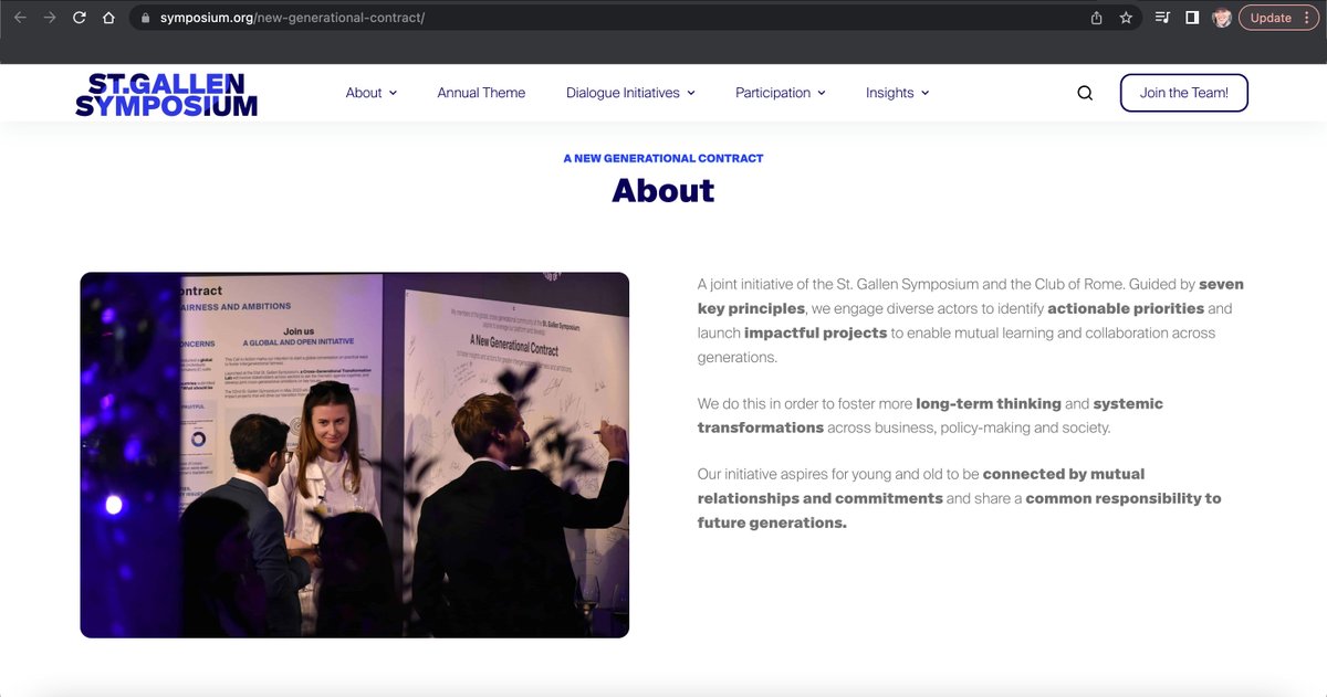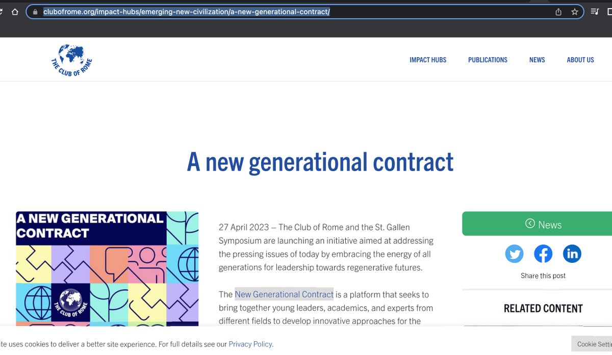 The Club of Rome has embarked on “New Generational Contract” & among their partners are the United Nation's "SDG Lab" (Sustainable Development Goals). Other partners include: https://www.clubofrome.org/impact-hubs/emerging-new-civilization/a-new-generational-contract/ Among Club of Rome's "New Generational Contract" Partners: IMD The Fifth Element ZEIT Online The Oxford Character Project Nuremberg Institute for Market Decisions The 50 Percent BCG Henderson Insight Global Change Makers Harvard Business Manager ZEIT Online Manager Magazin Dr. Bjorn Johansson Associates Global Board Advisors Zukunft-Fabrik 2050 https://www.clubofrome.org/impact-hubs/emerging-new-civilization/a-new-generational-contract/