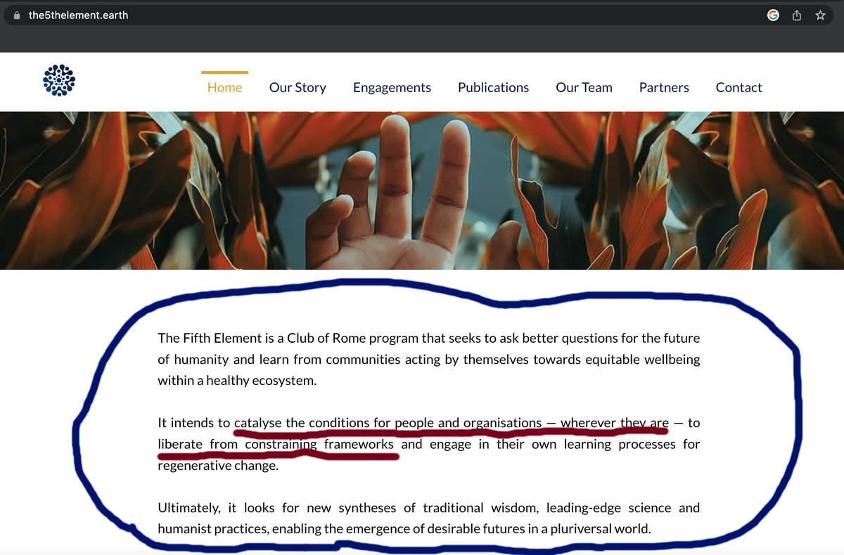 And we can't forget the Club of Rome "The Fifth Element Project: Catalysing the Emergence of a Human Revolution", featured at the WEF's "Davos 2023" Conference. IT'S ALL CONNECTED https://www.the5thelement.earth/ "The Fifth Element is a Club of Rome program that seeks to ask better questions for the future of humanity and learn from communities acting by themselves towards equitable wellbeing within a healthy ecosystem. It intends to catalyse the conditions for people and organisations — wherever they are — to liberate from constraining frameworks and engage in their own learning processes for regenerative change. Ultimately, it looks for new syntheses of traditional wisdom, leading-edge science and humanist practices, enabling the emergence of desirable futures in a pluriversal world." Exactly what "constraining frameworks" do you think they are advocating for people to be "liberated from"? Maybe those who attended the WEF's Davos 2023 conference would clue us in? Because it appears they want us to cast off all traditional forms of religion and culture and dive head-first into the sea of a humanistic naturism/neo-paganism. But that's just me.