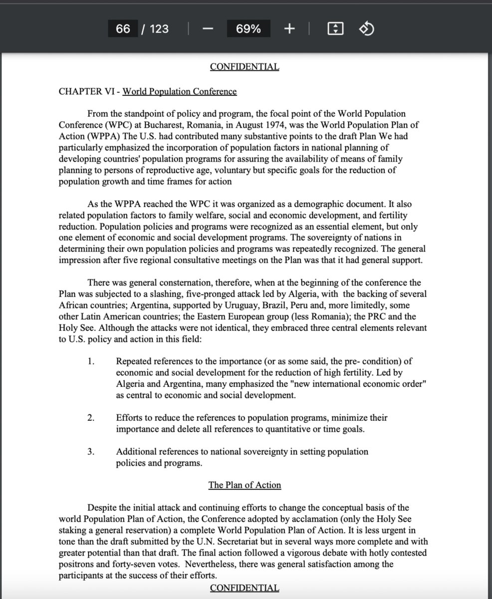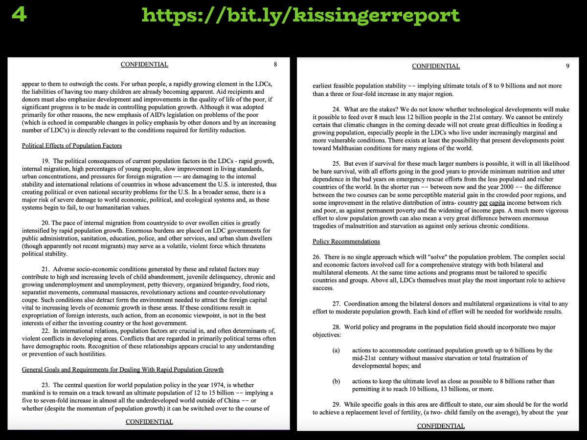 (6) How creepy! In reading the 123 page declassified "Kissinger Report" written in 1974 on developing an international depopulation plan, the "World Population Conference" where a "New International Economic Order" is referenced is found in Chapter 6 (page 66): https://bit.ly/kissingerreport 👀 "CONFIDENTIAL CHAPTER VI - World Population Conference From the standpoint of policy and program, the focal point of the World Population Conference (WPC) at Bucharest, Romania, in August 1974, was the World Population Plan of Action (WPPA) The U.S. had contributed many substantive points to the draft Plan We had particularly emphasized the incorporation of population factors in national planning of developing countries' population programs for assuring the availability of means of family planning to persons of reproductive age, voluntary but specific goals for the reduction of population growth and time frames for action As the WPPA reached the WPC it was organized as a demographic document. It also related population factors to family welfare, social and economic development, and fertility reduction. Population policies and programs were recognized as an essential element, but only one element of economic and social development programs. The sovereignty of nations in determining their own population policies and programs was repeatedly recognized. The general impression after five regional consultative meetings on the Plan was that it had general support. There was general consternation, therefore, when at the beginning of the conference the Plan was subjected to a slashing, five-pronged attack led by Algeria, with the backing of several African countries; Argentina, supported by Uruguay, Brazil, Peru and, more limitedly, some other Latin American countries; the Eastern European group (less Romania); the PRC and the Holy See. Although the attacks were not identical, they embraced three central elements relevant to U.S. policy and action in this field: 1. Repeated references to the importance (or as some said, the pre- condition) of economic and social development for the reduction of high fertility. Led by Algeria and Argentina, many emphasized the "new international economic order" as central to economic and social development. 2. Efforts to reduce the references to population programs, minimize their importance and delete all references to quantitative or time goals. 3. Additional references to national sovereignty in setting population policies and programs. The Plan of Action Despite the initial attack and continuing efforts to change the conceptual basis of the world Population Plan of Action, the Conference adopted by acclamation (only the Holy See staking a general reservation) a complete World Population Plan of Action. It is less urgent in tone than the draft submitted by the U.N. Secretariat but in several ways more complete and with greater potential than that draft. The final action followed a vigorous debate with hotly contested positrons and forty-seven votes. Nevertheless, there was general satisfaction among the participants at the success of their efforts." Oh, and I did not plan in advance on either READING this just now NOR did I plan for it to be the 6th tweet in my thread. Double creepy. 👀👀