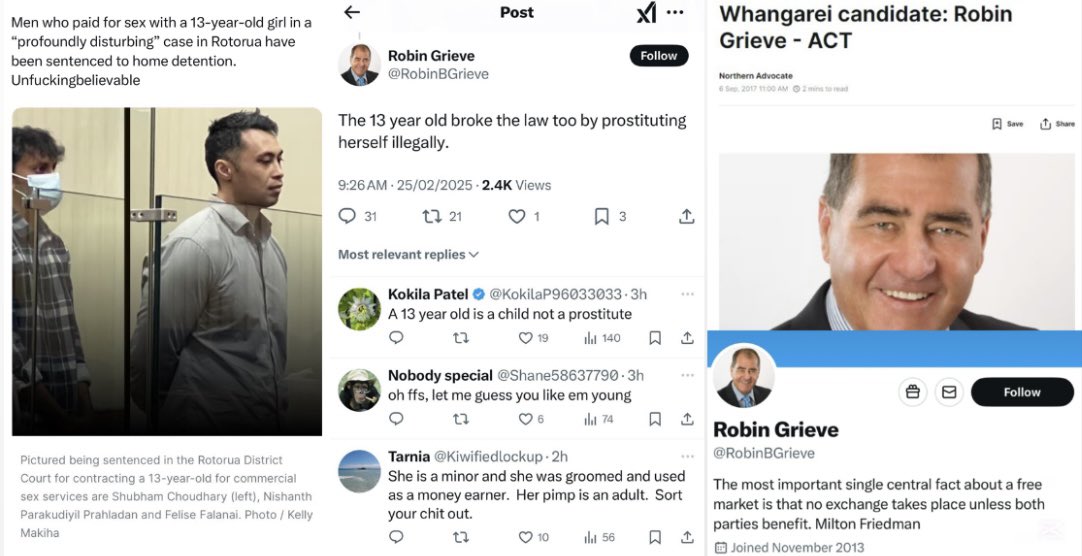 One thing you can say about the people Act attract, they are consistent. Robin Grieve who stood for Act 4 times, was on the board and is still an active member, has some decidedly disturbing opinions. Pointing out that a trafficked “13 year old girl broke the law too” by being a “prostitute”, comparing Golriz’ shoplifting to Tim Jago’s paedophilia.
