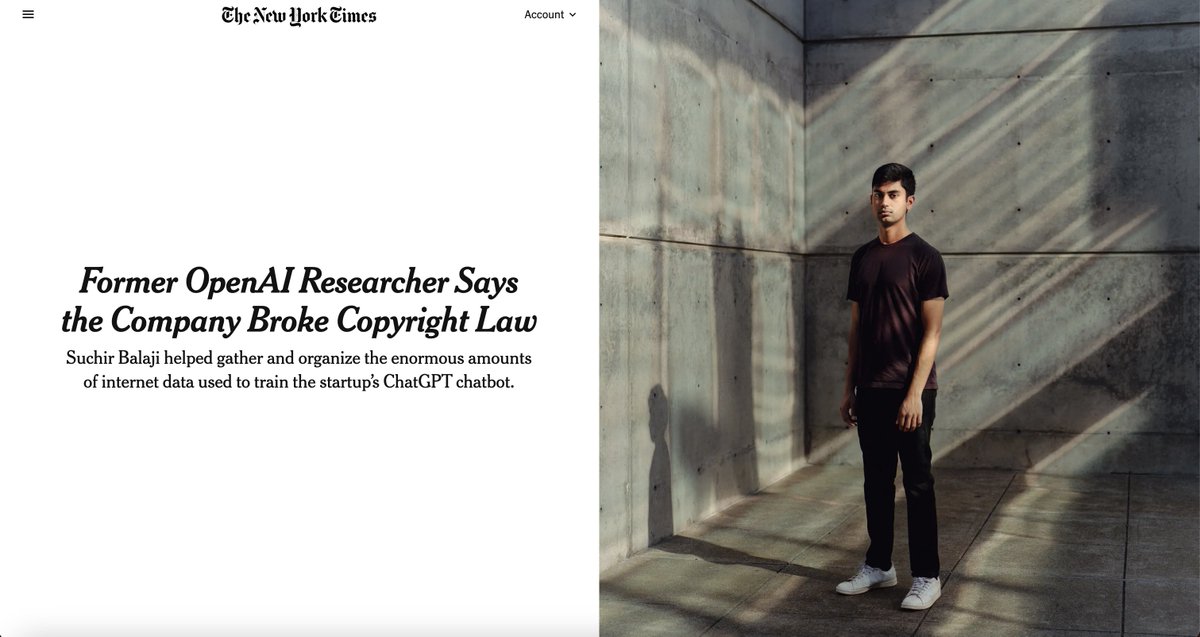 2/ AI for Good? Suchir Balaji joined OpenAI in 2020, believing in its potential to do good. But over time became concerned over its use of copyrighted material to train AI. He left in August 2024 and two months later, publicly accused OpenAI of violating U.S. copyright laws. https://t.co/PgOy5fKzZL