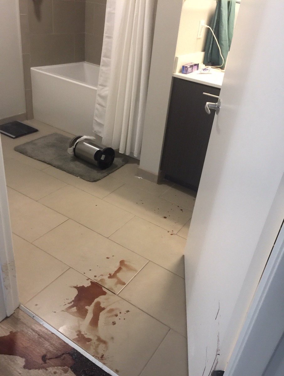 5/ But the "crime scene" told a different story: - Multiple pools of blood, suggesting movement or a struggle - Hair under the bathroom door - Displaced items: floss, earbuds, a toppled trashcan - No suicide note Does this sound like suicide to you? https://t.co/x83qAhS1f6
