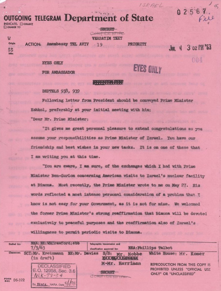 3/ In the summer 1963, President Kennedy sent a series of increasingly urgent letters to Israeli PM David Ben-Gurion (and later Levi Eshkol) demanding full inspections of Dimona — including threatening to cut off U.S. aid if Israel refused. A few months later, JFK was dead. 🤨 https://t.co/x6qmZO50Ih
