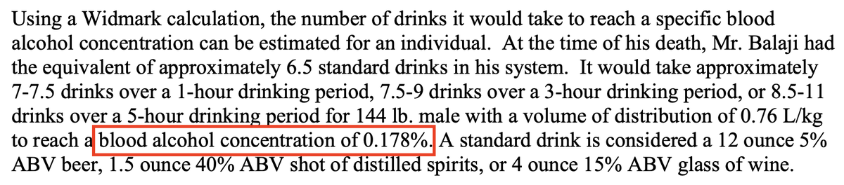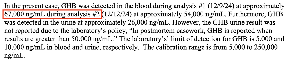 6/ The toxicology report raised even more red flags. Suchir had a blood alcohol level of 0.178% — well above the legal limit. He also had extremely high levels (in excess of 50,000 ng/mL) of GHB in his system, a "date rape" drug commonly used to incapacitate victims. https://t.co/7PIQASCXxj