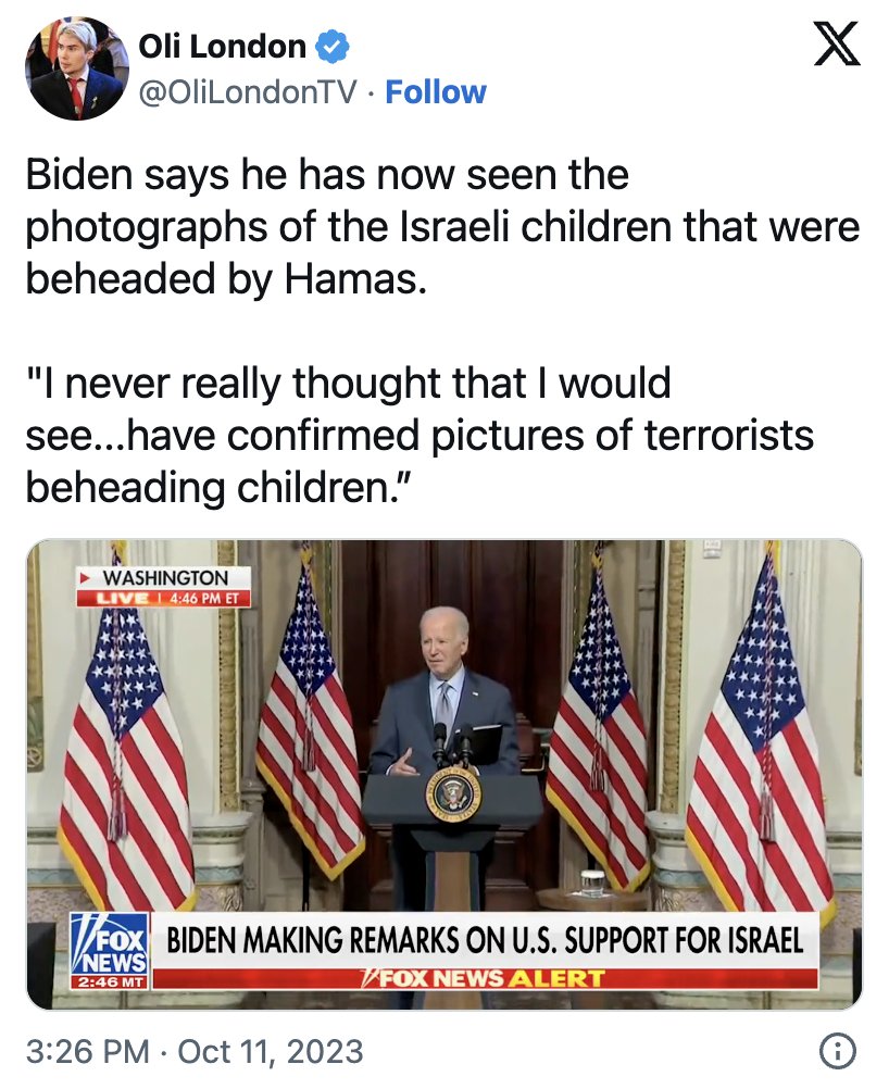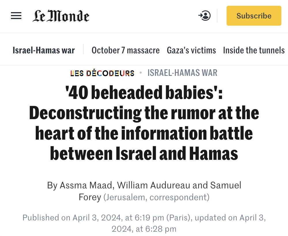 2/ 40 Beheaded Babies On October 10 reporter Nicole Zedeck of i24 News, a pro-Israeli news channel, claimed that she saw 40 babies with their heads cut off. This claim spread quickly, fueled by major media outlets, Israeli officials, and even President Biden. Except, no such thing happened according to numerous legacy publications, including CNN (which retracted their initial report), +972 Magazine, Le Monde, Business Insider (which cited Israeli officials retracting the claim), and Haaretz. But the lie continues to be regurgitated to this day, most notably by Kamala Harris in her debate last month against Donald Trump.