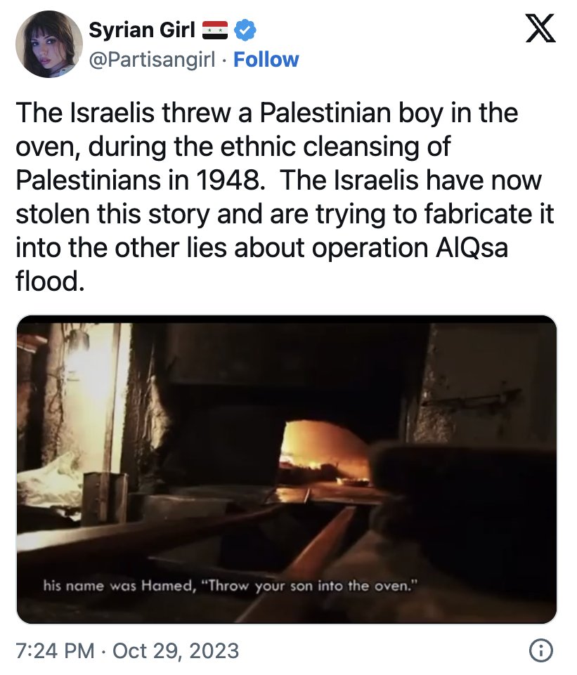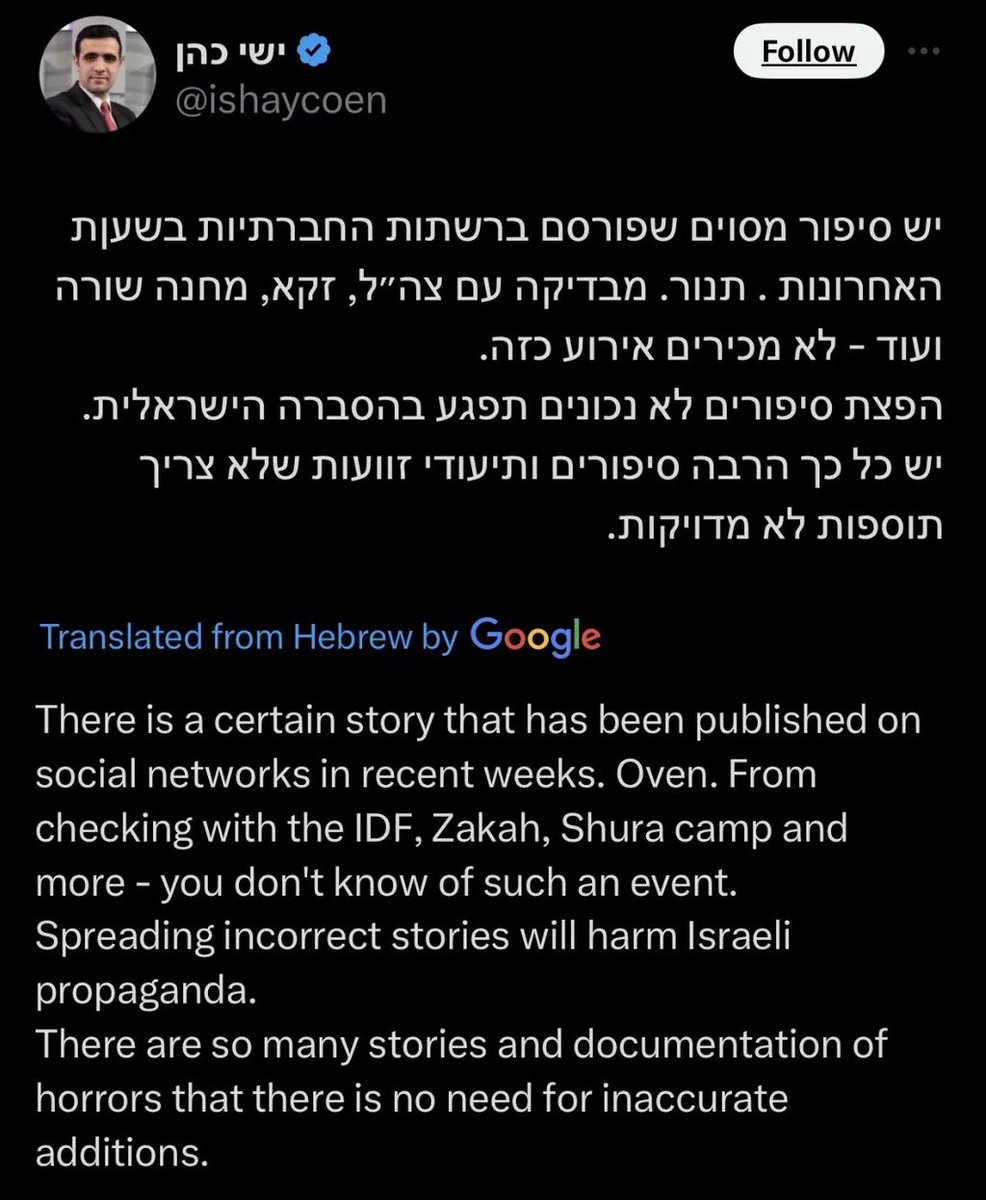 4/ Babies Killed in Ovens Eli Beer, President of United Hatzala, claimed that Hamas placed a baby in an oven during the Oct. 7 attacks. This shocking story was repeated in major media outlets, including CNN, Fox, and the Daily Wire. However, Israeli journalists later found no evidence to support the claim, and it was not until several months later that Beer admitted he hadn't witnessed it himself. Haaretz later acknowledged the story as untrue. But it’s worth noting, it was the Israelis who reportedly threw a Palestinian boy in an oven during the Nakba of 1948.
