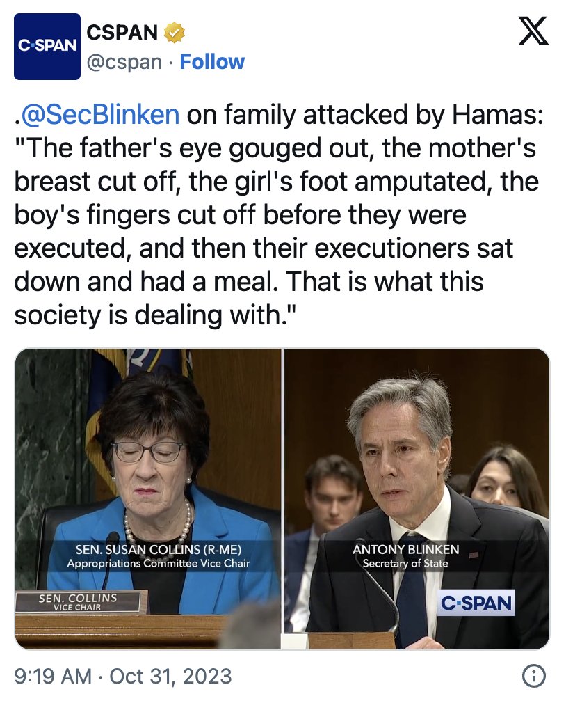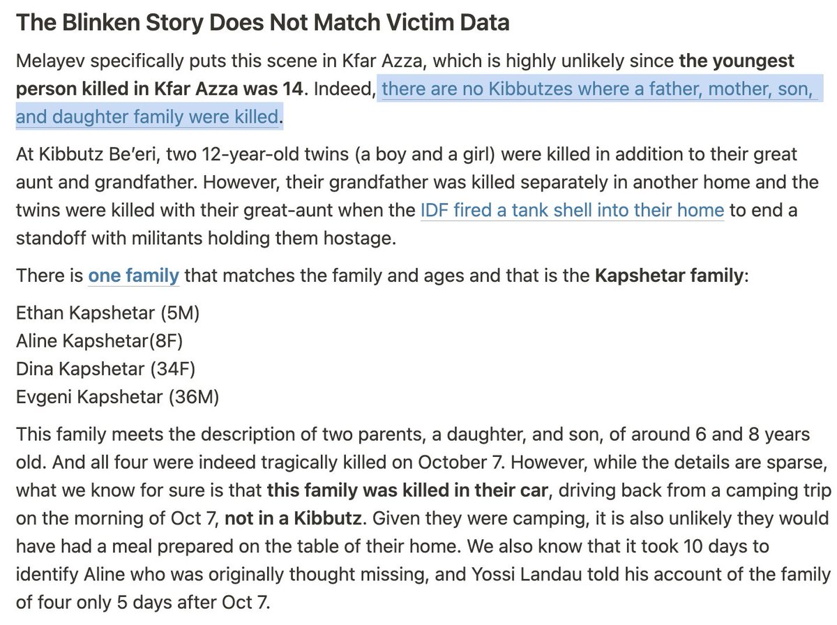 5/ Family of 4 Tortured Around Dining Table On October 31, Secretary of State Antony Blinken shared a gruesome story during a Senate hearing, claiming that a family of four, including two young children, were tortured and mutilated by Hamas attackers, with details like gouged eyes, amputated limbs, and terrorists sitting down to eat at the family’s table. This shocking account was repeated across major media outlets, further fueling outrage. However, the story was later debunked by multiple sources, including Israeli journalists and victim data, which found no evidence of a family matching this description. But nonetheless, the horrifying shocking but untrue accounts had already spread widely, shaping public perception and justifying continued U.S. military support for Israel, despite the lack of evidence behind the narrative.