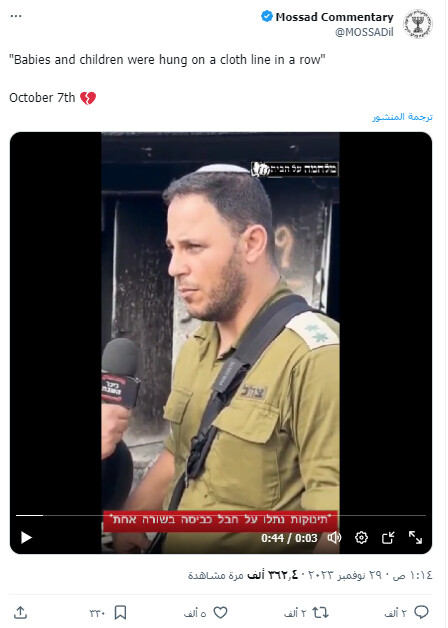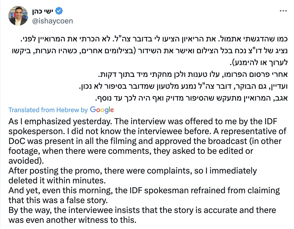 6/ Babies Hung on Clotheslines On November 28, Israeli journalist Ishay Coen posted an interview claiming that Hamas hung dead babies on clotheslines during the October 7 attack. The claim, made by Lt. Col. Yaron Buskila, spread widely on Israeli social media but was later debunked. Coen eventually deleted the post, admitting the story may not have been accurate. Haaretz confirmed that death toll numbers from the National Insurance Institute of Israel showed no evidence of babies being hung on clotheslines.