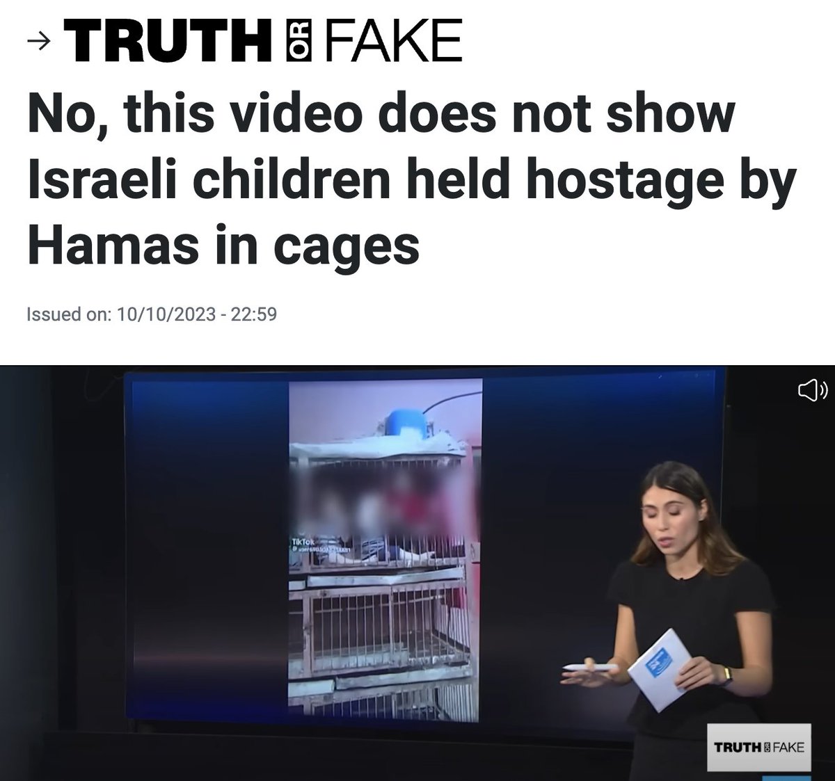 7/ Hamas Put Babies in Cages In the days following the October 7 attacks, a video showing children in cages was widely shared on social media, with captions falsely claiming they were Israeli hostages held by Hamas. This claim was quickly debunked by fact-checking sources such as FakeReporter, France24, and Snopes. All confirmed the video was not related to Israeli hostages, and that there is no evidence supporting the claim that Hamas kept children in cages.