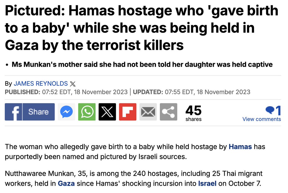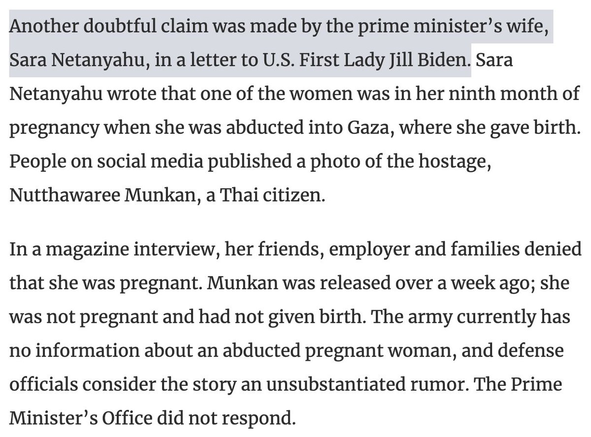 8/ Pregnant Woman Forced to Give Birth in Captivity In November, Sara Netanyahu sent a letter to First Lady Jill Biden claiming that a pregnant Israeli woman, allegedly a Thai national named Nutthawaree Munkan, had been held captive by Hamas and gave birth while in captivity. The story was later debunked by Haaretz. According to the report, Munkan's friends, family, and employer denied that she was pregnant, and Israeli defense officials confirmed there was no evidence of a pregnant woman being abducted. When Munkan was released, she appeared on video, showing no signs of pregnancy or having given birth. Despite this, the claim had already spread widely online, including coverage by The Daily Mail and Visegrad 24, before being proven false.