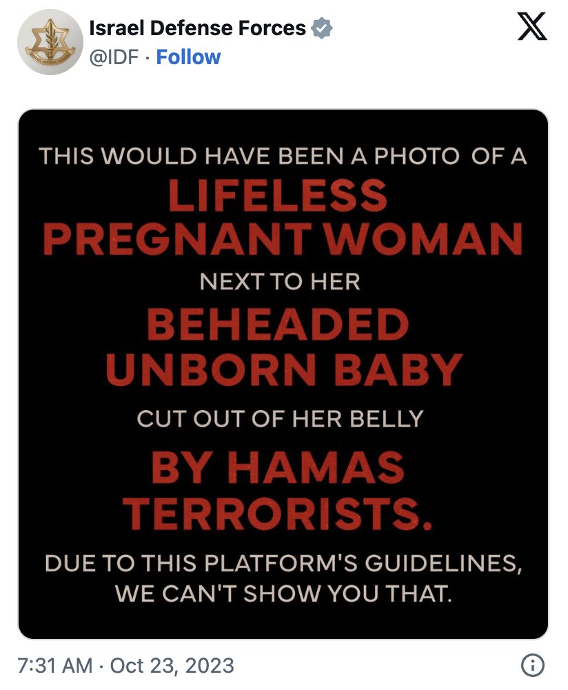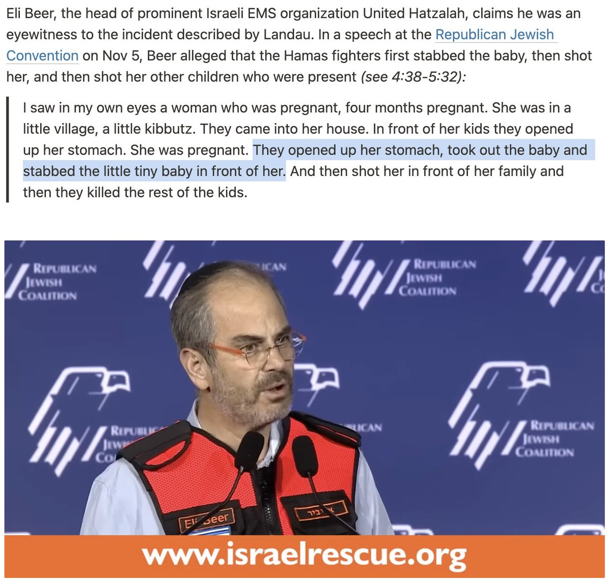 9/ Hamas Beheaded Unborn Baby Claims that Hamas militants killed a pregnant woman, cut open her stomach, and beheaded her baby were widely circulated by Israeli officials, media, and social platforms. The story, initially shared by Yossi Landau from ZAKA, was echoed by others, including Eli Beer and the IDF. However, it was later debunked by Haaretz and fact-checkers, who found no evidence supporting the incident.
