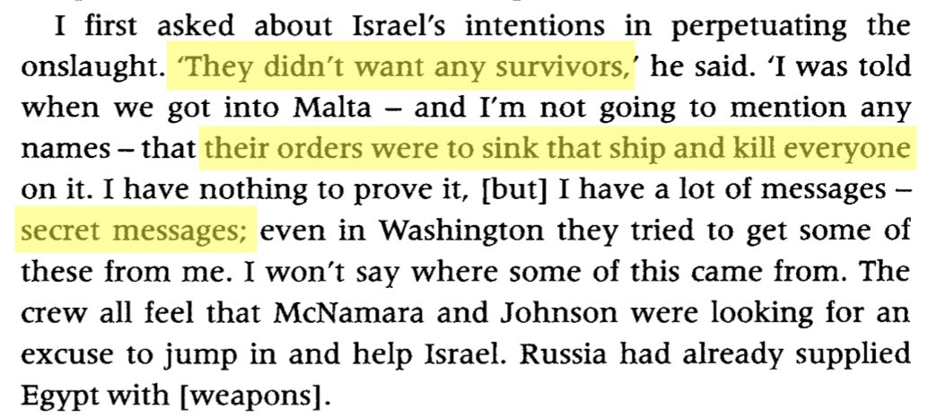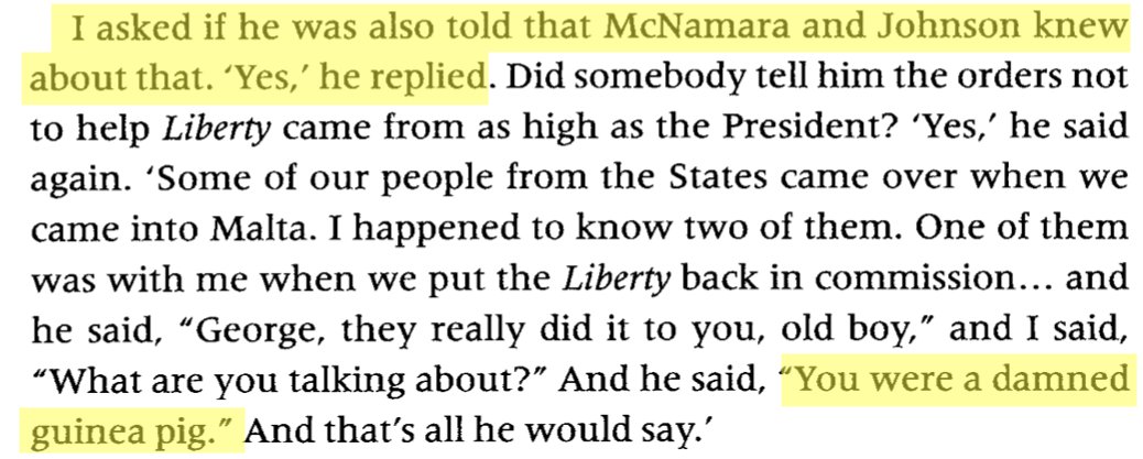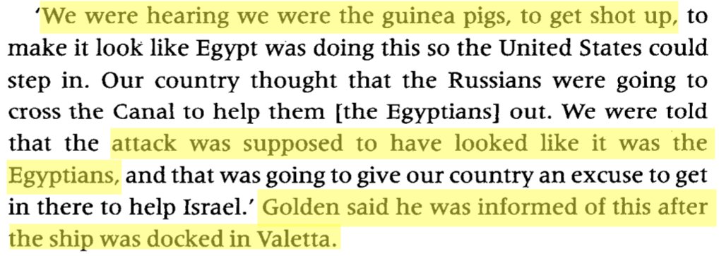 7/ In the book 'Project Cyanide', the USS Liberty's chief engineer, George Golden told journalist Peter Hounam he received secret messages — they were "guinea pigs", orders to "sink the ship" and "make it look like Egypt was doing this," and that "Johnson and McNamara knew." https://t.co/aqbmOjiGdE