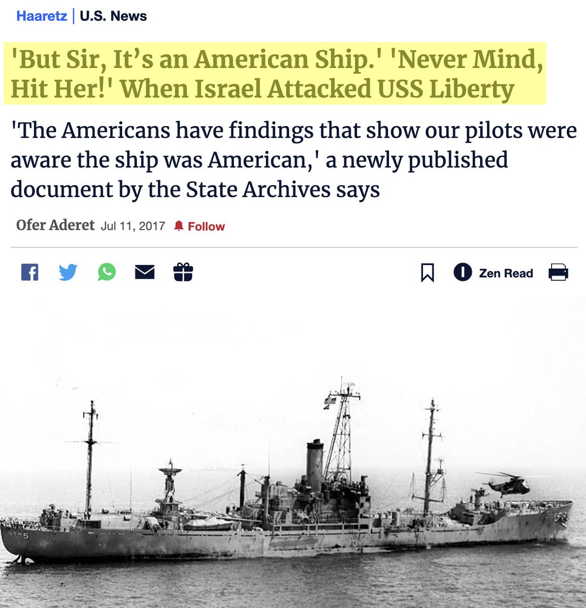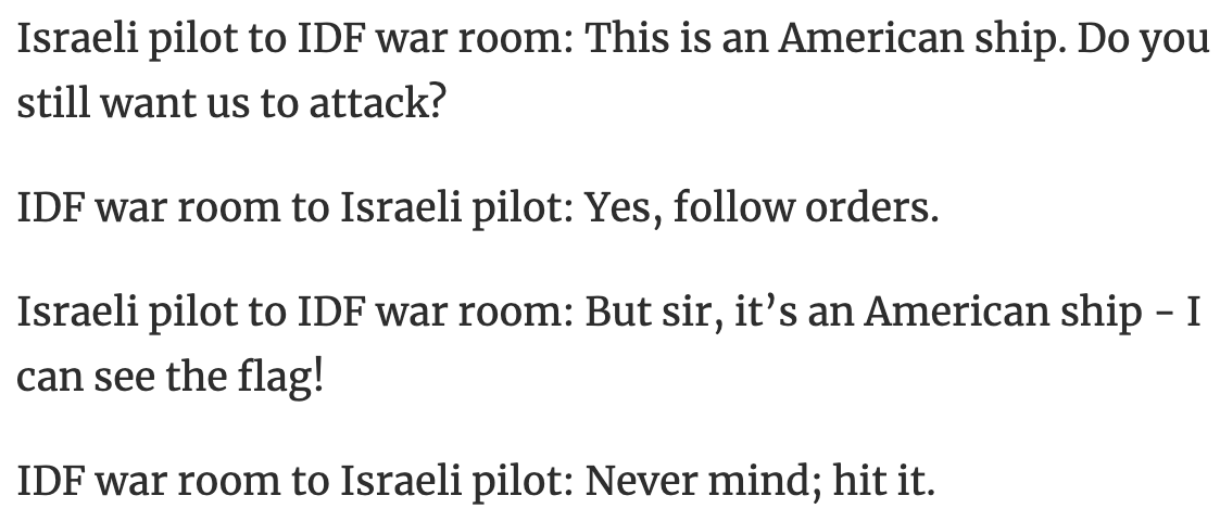 9/ Day of the attack: The evidence is abundantly clear that the Israeli fighter pilots who carried out the attack were 100% aware that the ship was American, and even questioned why they were asked to fire. Israeli newspaper Haaretz published the transcripts in 2017: https://t.co/iWgCgfXb3R