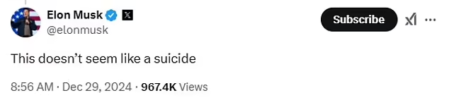 12/ Given the timing and circumstances surrounding his death — would Suchir Balaji commit a self-checkout? Or could something more nefarious have happened. Here's what @elonmusk thinks. ⬇️ What about you? https://t.co/WdCuAuVGZp