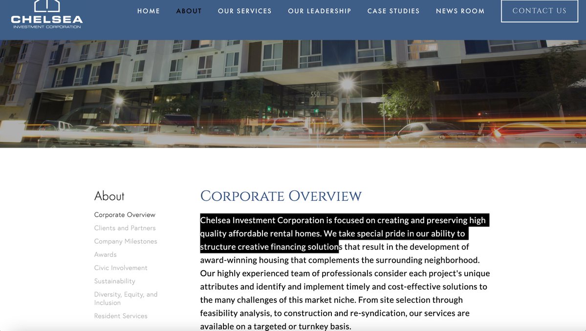 5/ But here is where things gets even sketchier. There is one investment group that pops up over and over again in all these city housing deals — the Chelsea Investment Corporation. https://t.co/yOZP4hY1U3