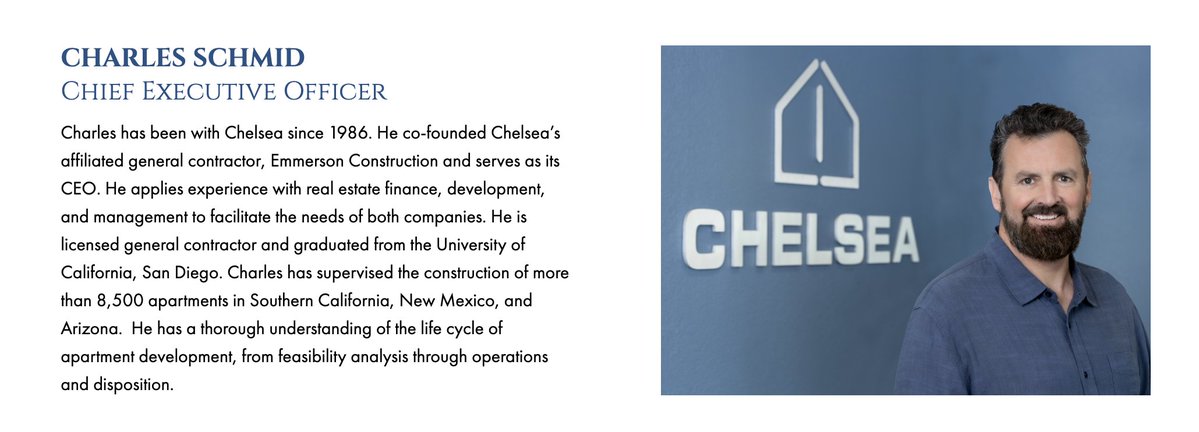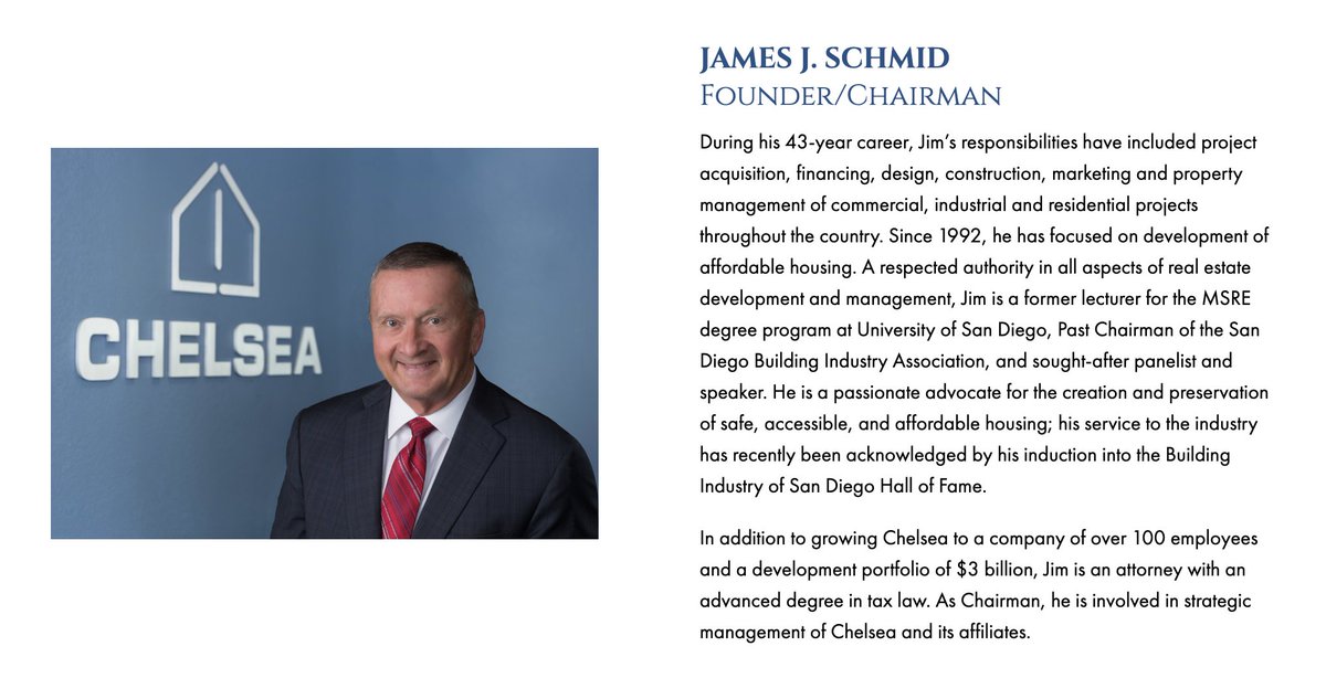 6/ Here's what we know about The Chelsea Investment Group: - a developer that specializes in "affordable housing" - incorporated in the Cayman Islands - HQ is in Carlsbad, CA - Founder, Jim Schmid - CEO, Charles Schmid https://t.co/z2HQ3RuJht