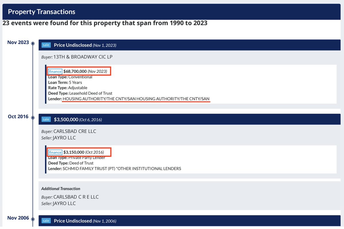 7/ You ready for a real doozy? Property records of their HQ address shows: - 2016: Sold for $3.5M, $3.15M financed. - 2023: Another transaction for an "undisclosed price," but $68M financed. The kicker, the lender is the SD Housing Authority. Not suspicious at all... 🤨 https://t.co/KFhh7rrYoB