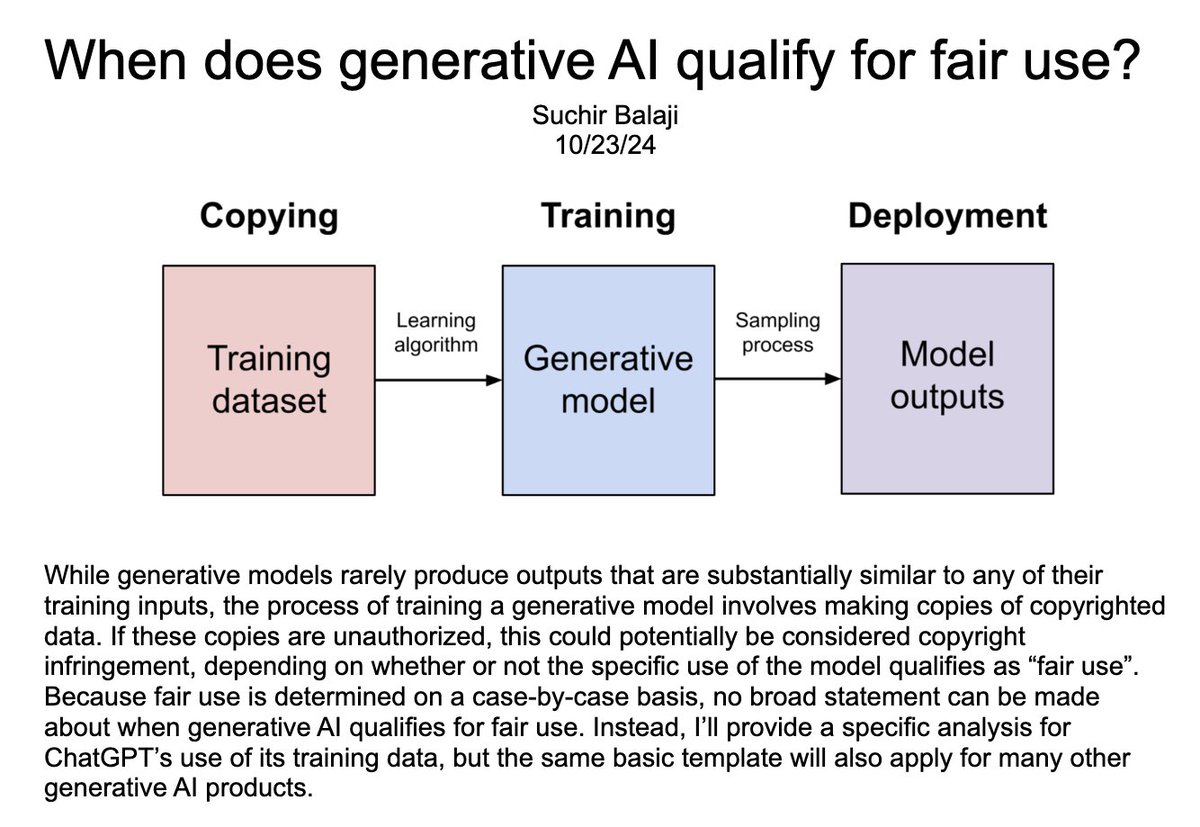 7/ Generative Model Analysis Balaji argued the technology violates the law because in many cases it directly competes with the copyrighted works it learned from, with the model designed to imitate “basically anything” on the internet. https://t.co/z4yBUJcQBp