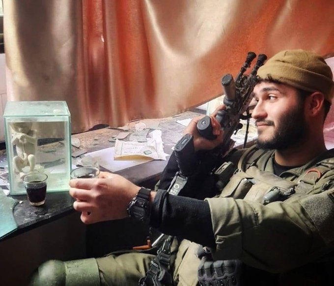 Cette photo postée sur les réseaux sociaux par un soldat israélien est plus que préoccupante Elle aurait été prise à Gaza Le lieu précis est inconnu Néanmoins les détails sont effrayants !!! D’où vient le fœtus dans un aquarium de formol ??? Qui peut faire cela … de quoi s’agit il ?
