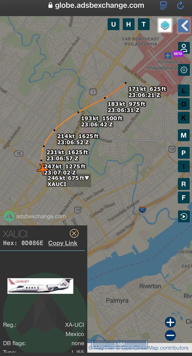 Mexican registered Learjet 55 has just crashed while departing northeast Philadelphia airport. Final data point shows -11000 feet per minute descent. https://globe.adsbexchange.com/?icao=0d086e&lat=40.043&lon=-75.047&zoom=13.4&showTrace=2025-01-31&trackLabels