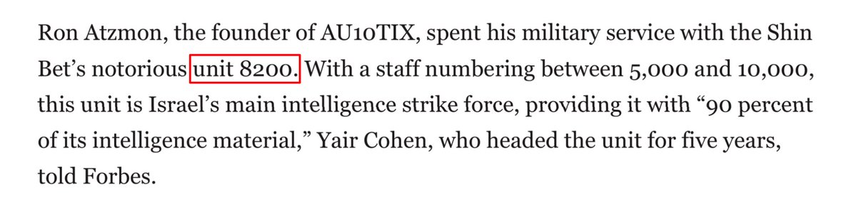 The founder of AU10TIX, Ron Atzomn, is a retired member of the IDF’s clandestine unit 8200, which provides Israel with 90% of its intelligence material. Follow: @AFpost https://t.co/FHS7cZV8oC