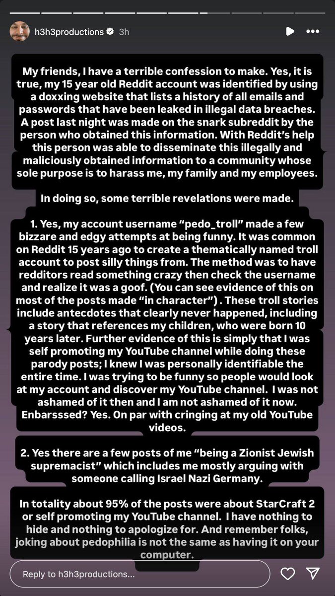 Israeli-American YouTuber Ethan Klein has confirmed that he ran a Reddit account called “pedo_troll,” where he posted pro-Zionist and pedophilic posts. Klein admits to managing the account but claims to have been acting in character. Follow: @AFpost https://t.co/85crKq2oNf