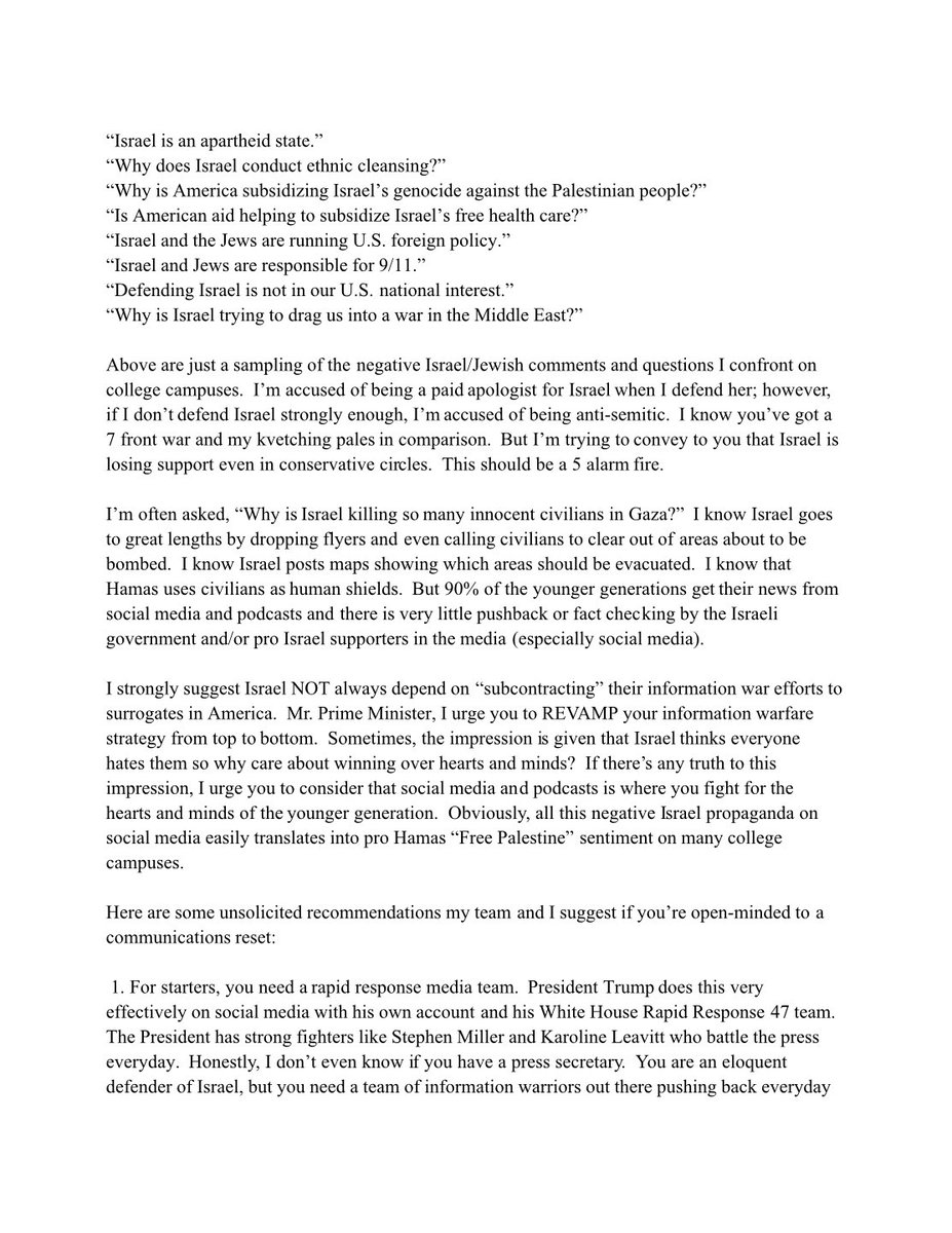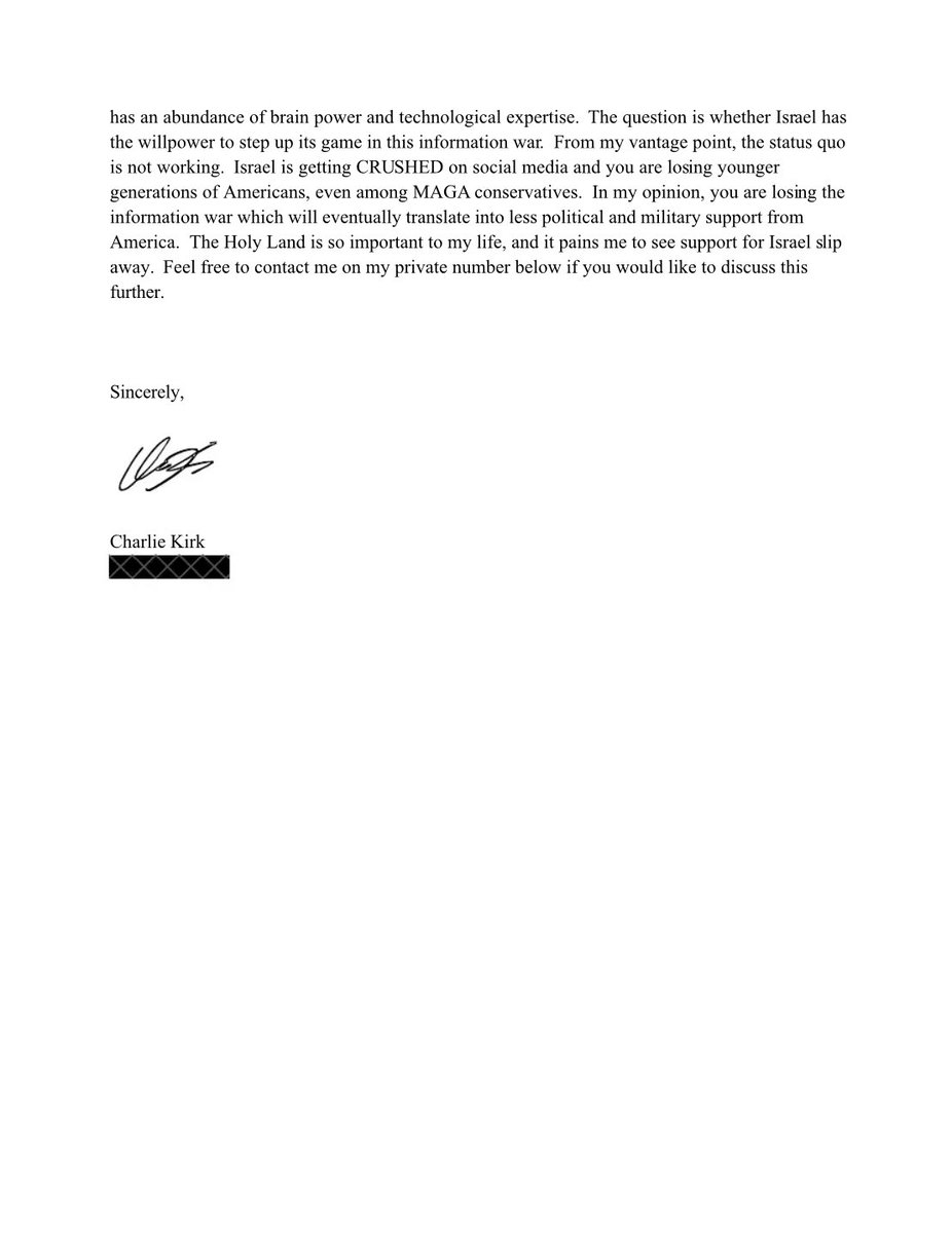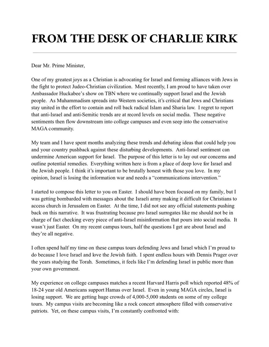 The letter Charlie Kirk sent to Netanyahu in May advised the Israeli leader on how to counter “anti-Israel sentiment” among Gen Z and the “information war” being waged against the Jewish state. In the letter, Kirk stressed that Israel needs a ‘communications intervention’ with the American public, stating that dwindling support for the “Holy Land” “pains” him to see. To combat rising anti-Zionism among the youth, Kirk urged Netanyahu to create an “Israel Truth Network” staffed by young people to convey that Israel is a “great friend of America” to Gen Z Americans, to bring Israelis held hostage in Gaza on a “speaking tour” across the country, to conduct on-the-street interviews with Israeli minority groups entitled ‘Dude, you got us wrong!’, and to have more of Netanyahu’s own clips translated from Hebrew into English. Kirk also suggested that Israel could do more for America, such as offering hurricane aid with a Star of David on it, in order to boost American “political and military support.” Pleading with Netanyahu to stop ‘subcontracting’ hasbara efforts to American surrogates, Kirk pledged to push the propaganda to his young audience. Identifying himself as a defender of “Judeo-Christian civilization,” Kirk assured Netanyahu of his unwavering pro-Israel stance and insisted that his concerns came from a place of “love for Israel and the Jewish people.” Follow: @AFpost