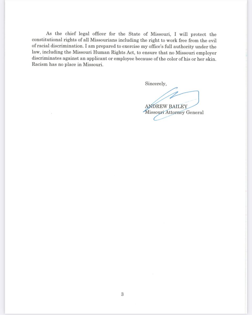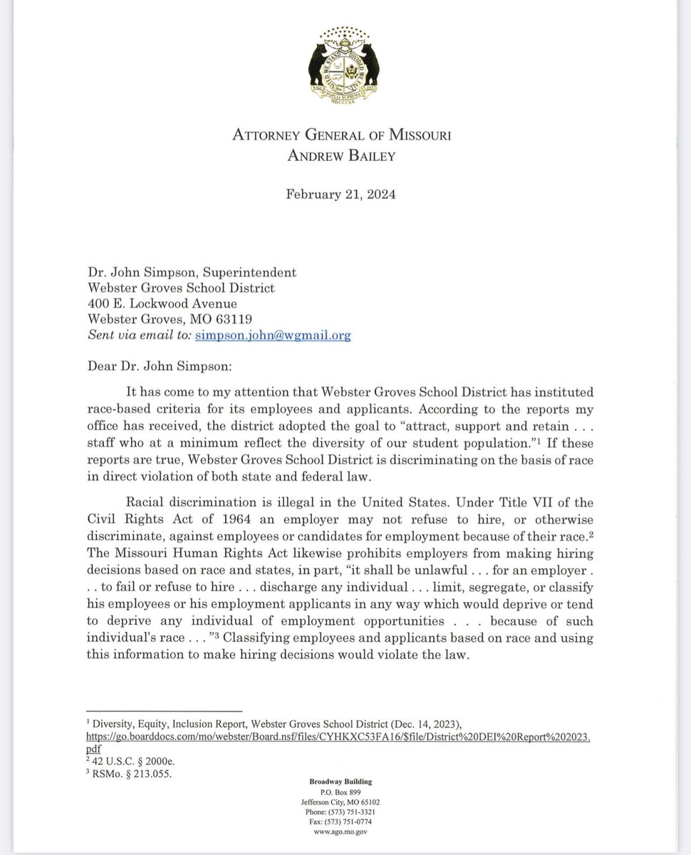 /16 Read more about my team’s efforts to combat discrimination here: https://ago.mo.gov/attorney-general-bailey-warns-school-districts-to-immediately-cease-discriminatory-practices-against-students-and-staff/
