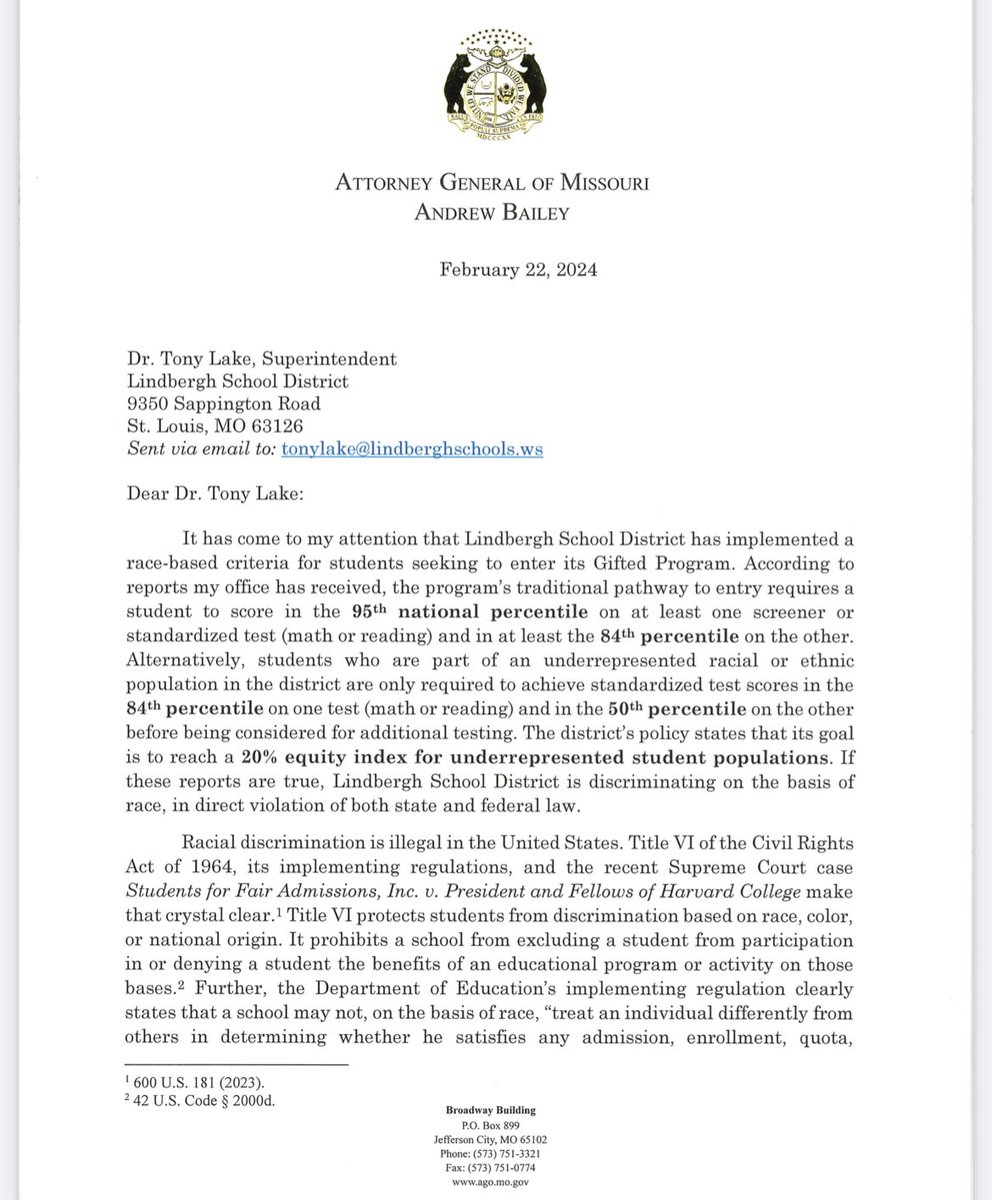 /2 I’ve received reports that Lindbergh School District has instituted a race-based criteria for students seeking to enter the gifted program.