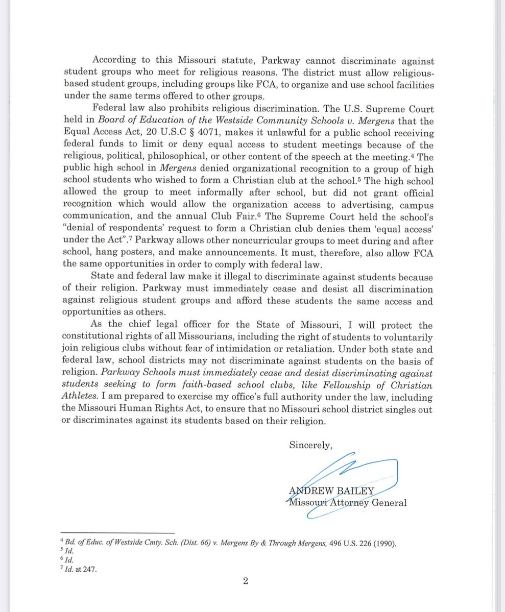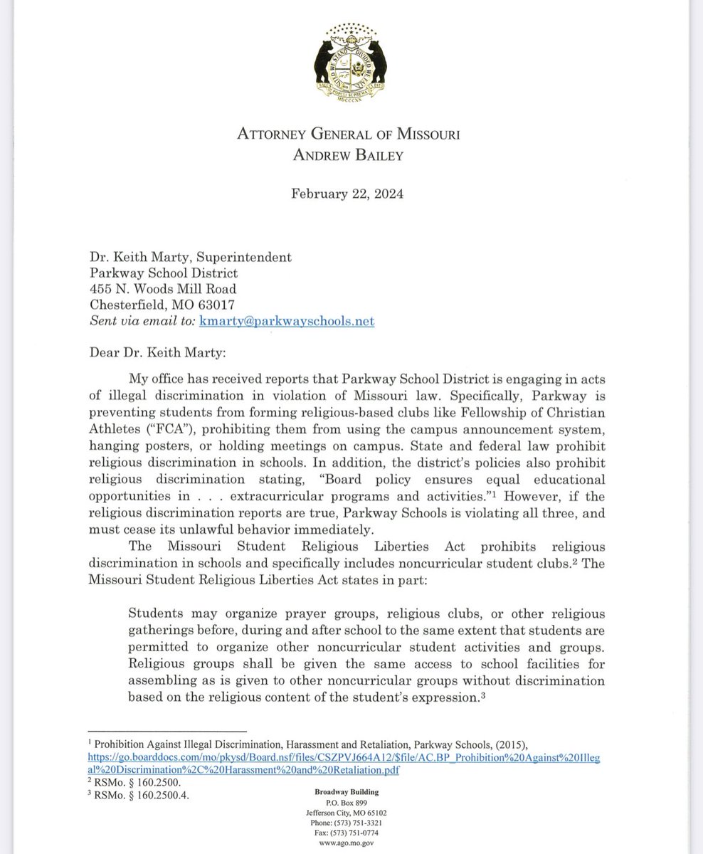 /7 I’ve also received reports that Parkway School District is preventing students from forming religious-based clubs like Fellowship of Christian Athletes.