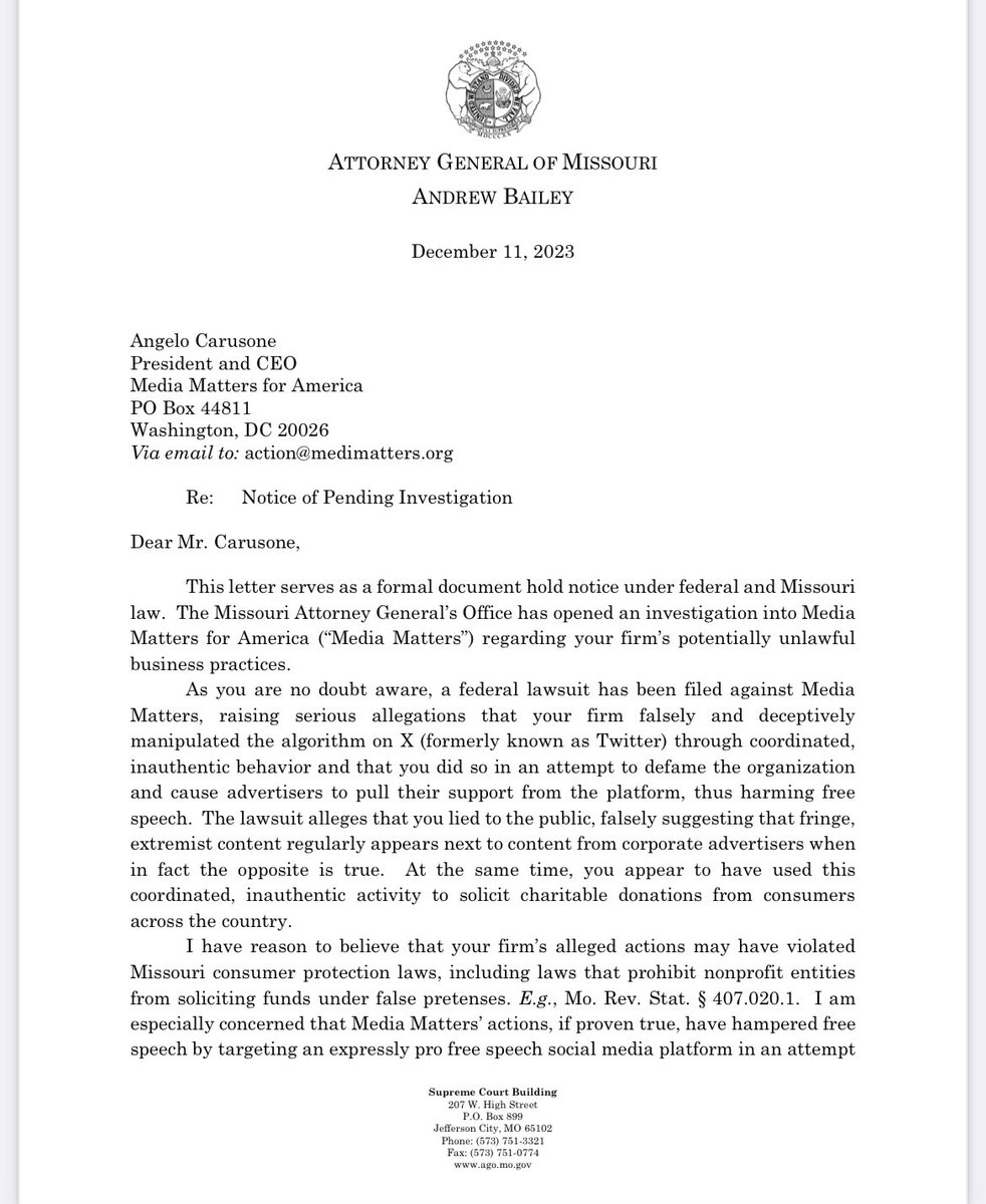 🚨BREAKING: We have reason to believe Media Matters used fraud to solicit donations from Missourians in order to bully advertisers into pulling out of X, the last platform dedicated to free speech in America. We have launched an investigation.