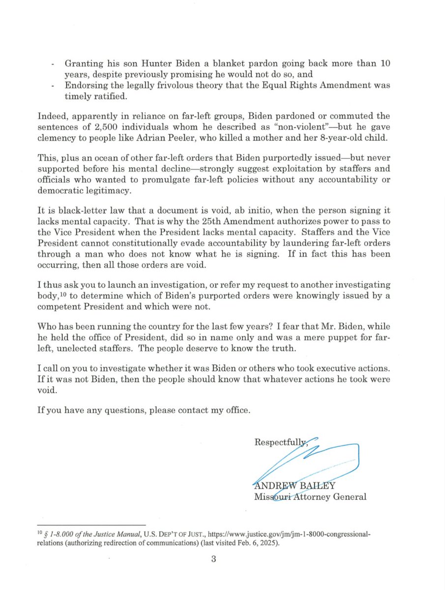 🚨BREAKING: I am demanding the DOJ investigated whether President Biden’s cognitive decline allowed unelected staff to push through radical policy without his knowing approval. If true, these executive orders, pardons, and all other actions are unconstitutional and legally void. https://t.co/pOhATRfw2j