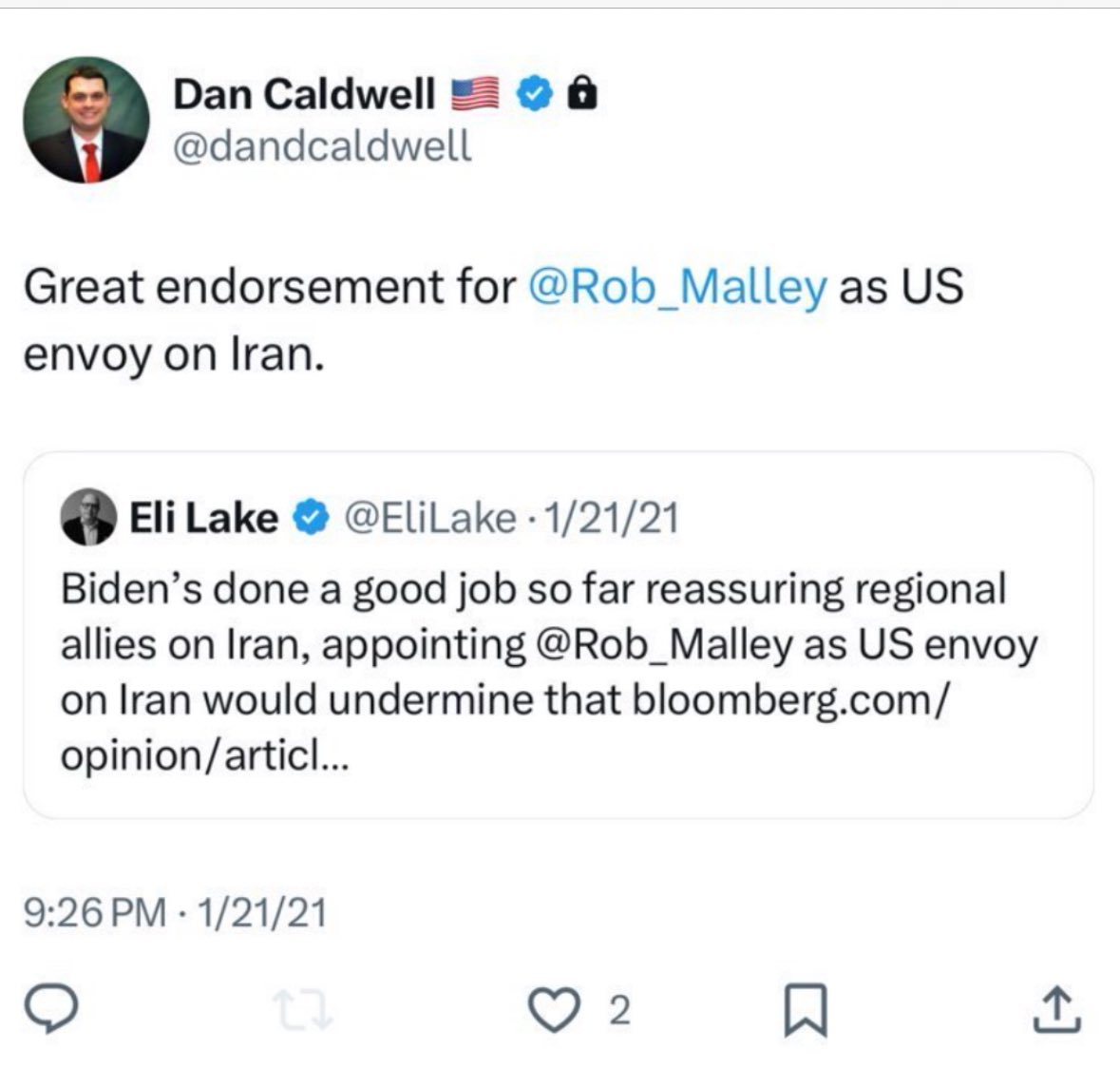 Additional flashback: Caldwell praised appointment of Rob Malley as US envoy to Iran during the Biden admin. Malley would go on to have his security clearance revoked amid an FBI investigation into mishandling of classified docs & a Tehran influence campaign in the State Dept. https://t.co/eEC0FlV9Ut