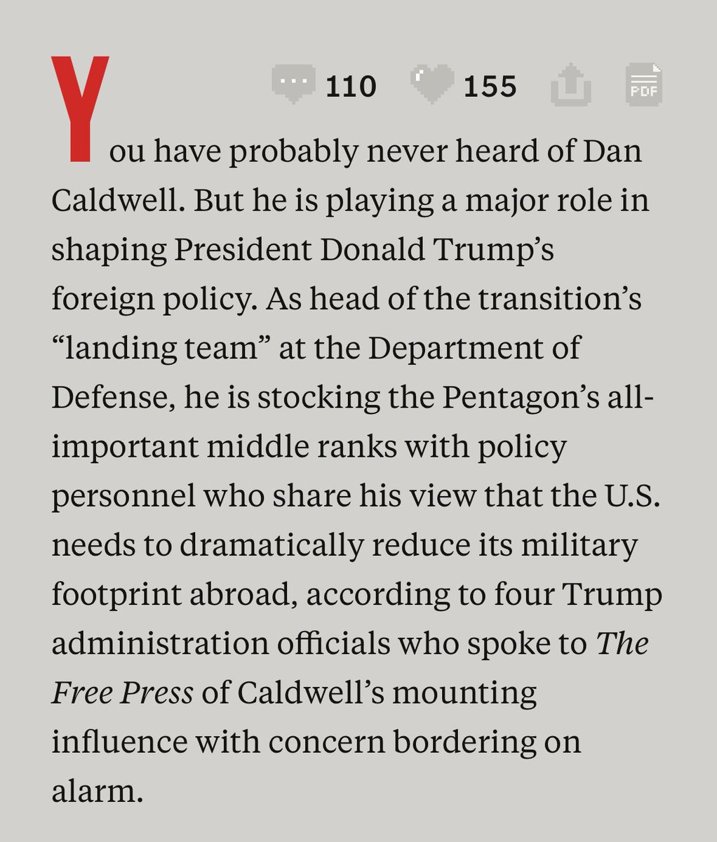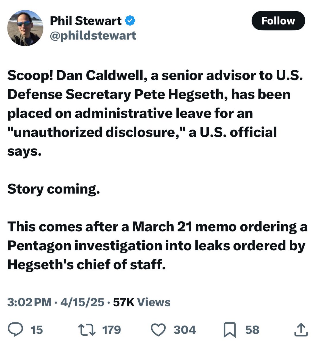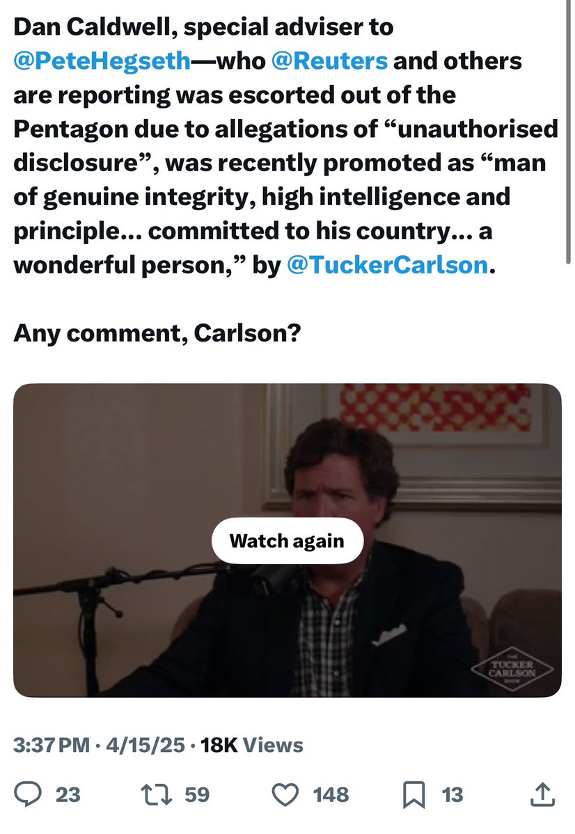 Story in 3 parts. Part 1: Concerns raised about Dan Caldwell pushing isolationist appointments at the Pentagon. Part 2: Tucker claims it’s a smear campaign and Caldwell is a “man of genuine integrity. Part 3: Caldwell put on leave after investigation into recent leaks. https://t.co/4dXh5Bqivy