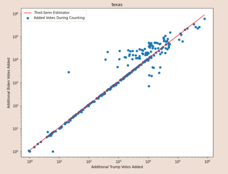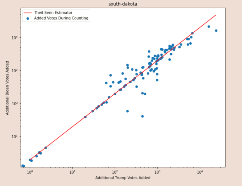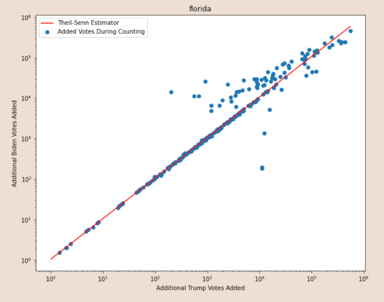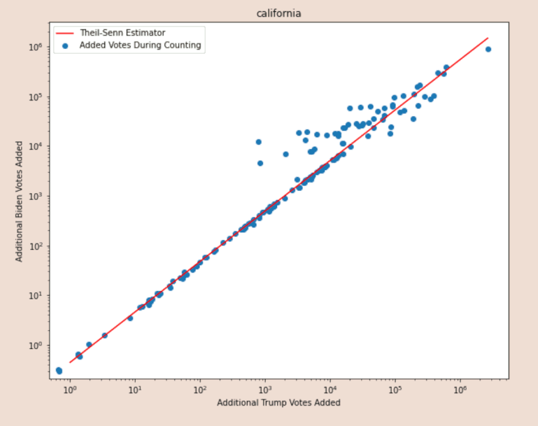 As we can see on this log-log plot, for many of the counting progress updates, we see an almost constant ratio of #Biden to #Trump. It's such a regular pattern that we can actually fit a linear regression model to it with near-perfect accuracy, barring some outliers.