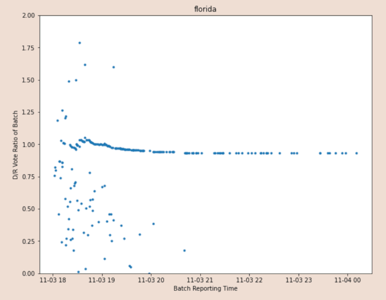 Here is a plot of the same Florida voting data, but this time it's the ratio of #Biden to #Trump ballots, versus time. What we see is that the initial ballot reportings are very noisy and "random". https://t.co/FMgzvdhJu4
