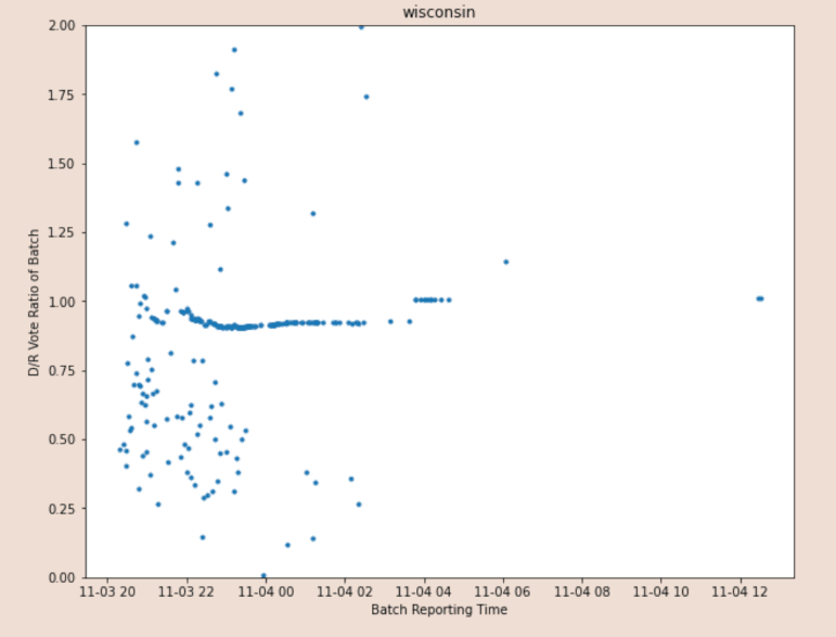 By 4am the D to R ratio was all thrown out of whack. That is because these ballots were not sampled from the real Wisconsin voter population, and they were not randomized in the mail sorting system with the other ballots. They inherently have a different D to R signature...