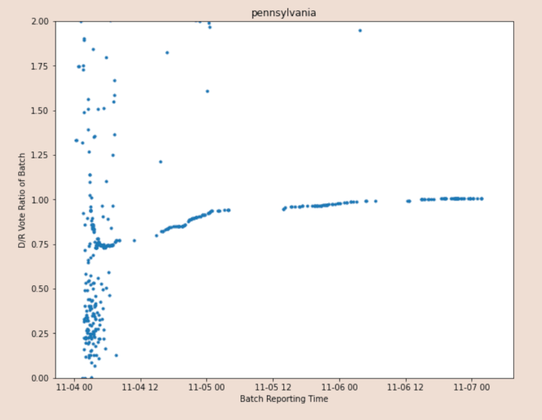 Here is Pennsylvania's vote counting history. For the first part of the vote counting process, we see the same pattern for mail-in ballots that we've seen in every other state in the country, which is relatively stable D to R ratio that gradually drifts R as more ballots...