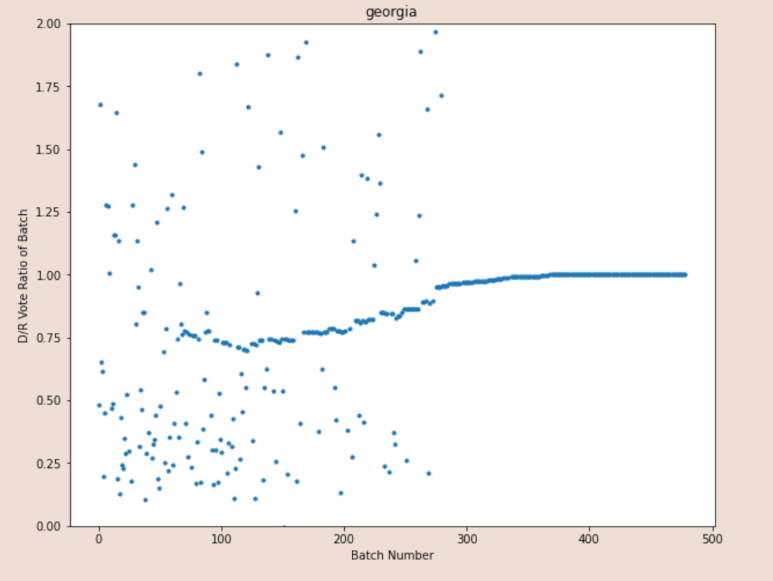 Now we're getting into the really good stuff. When we see mail-in ballot counting where there isn't relatively stable ratios of D and R ballots that slightly drift R, we have an anomaly! Anomalies themselves are not necessarily fraud, but they can help us spot fraud more easily.