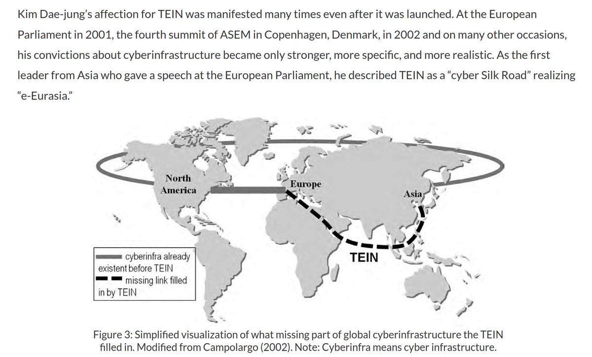 >President Kim Dae-jung in South Korea, who served on the National Committee on Science and Technology before his election, approved $1.1 billion in funds for nanotechnology research. Once in the Blue House, he campaigned successfully to make his country a world leader in the application of IT and broadband communications—which it is today.16 >Kim Dae-jung’s affection for TEIN was manifested many times even after it was launched. At the European Parliament in 2001, the fourth summit of ASEM in Copenhagen, Denmark, in 2002 and on many other occasions, his convictions about cyberinfrastructure became only stronger, more specific, and more realistic. As the first leader from Asia who gave a speech at the European Parliament, he described TEIN as a “cyber Silk Road” realizing “e-Eurasia.” CYBER SILK ROAD
