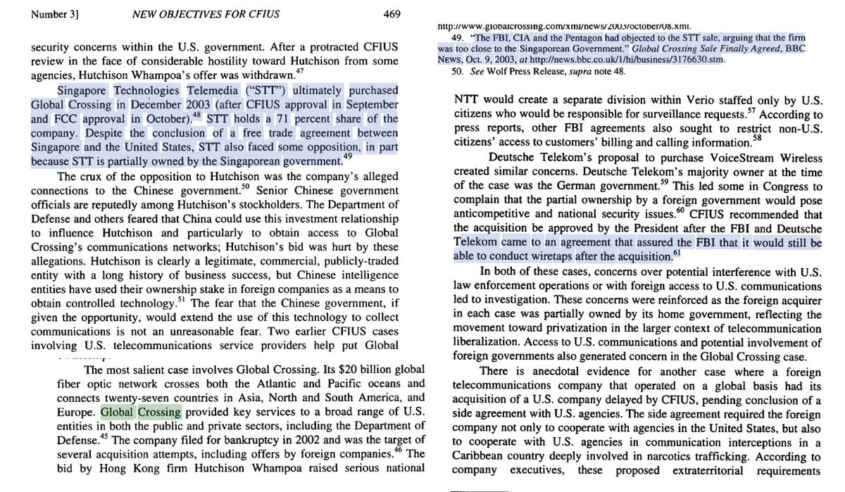 GLOBAL CROSSING WAS A FRONT COMPANY AND A GLOBAL SPY NETWORK THAT FOCUSED ON TAPPING INTER-CONTINENTAL FIBER OPTIC LINES AND INTERCEPTING COMMUNICATIONS BOTH DOMESTIC AND INTERNATIONAL BETWEEN THE US, WESTERN EUROPE, JAPAN, AND SINGAPORE. https://www.repository.law.indiana.edu/cgi/viewcontent.cgi?article=1413&context=fclj&httpsredir=1&referer=