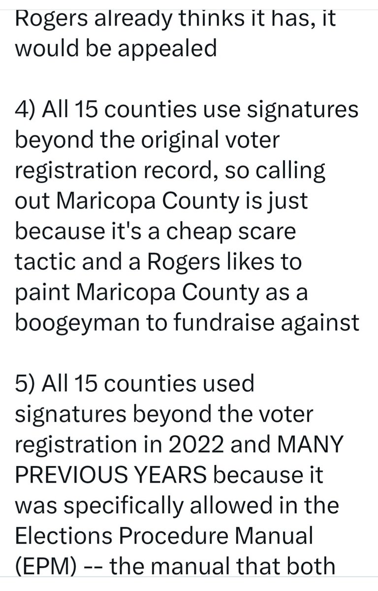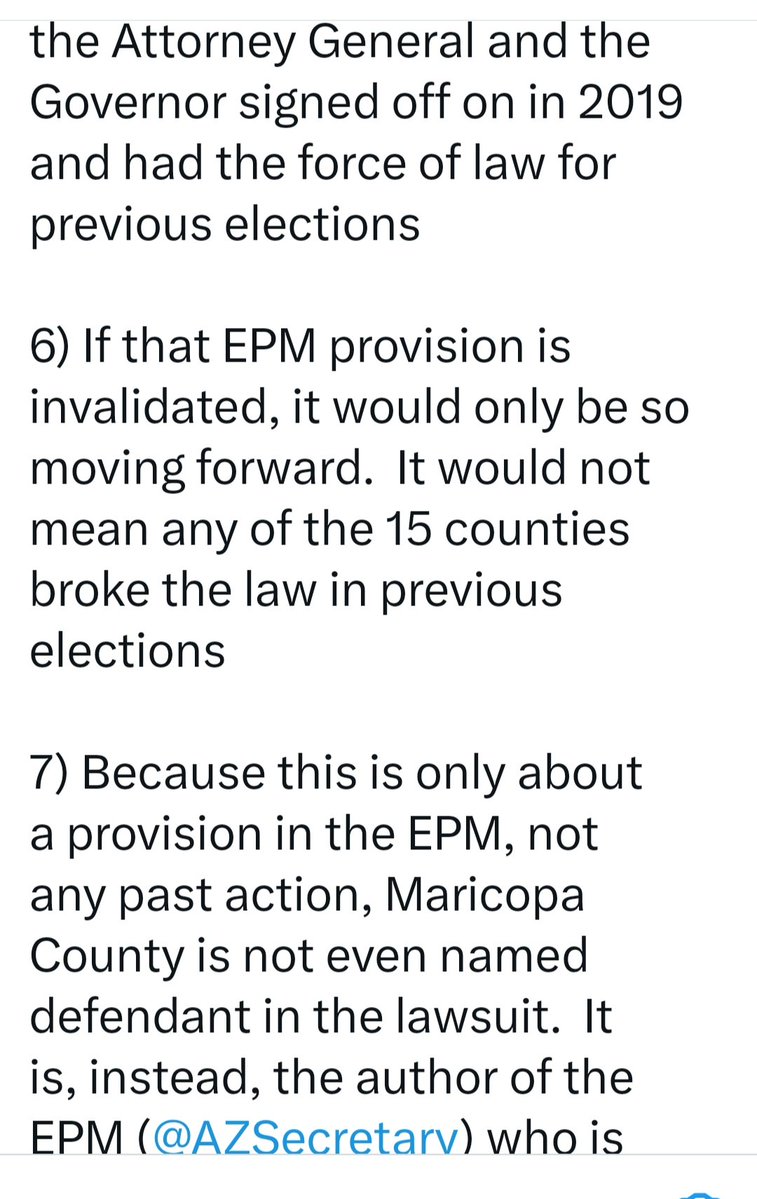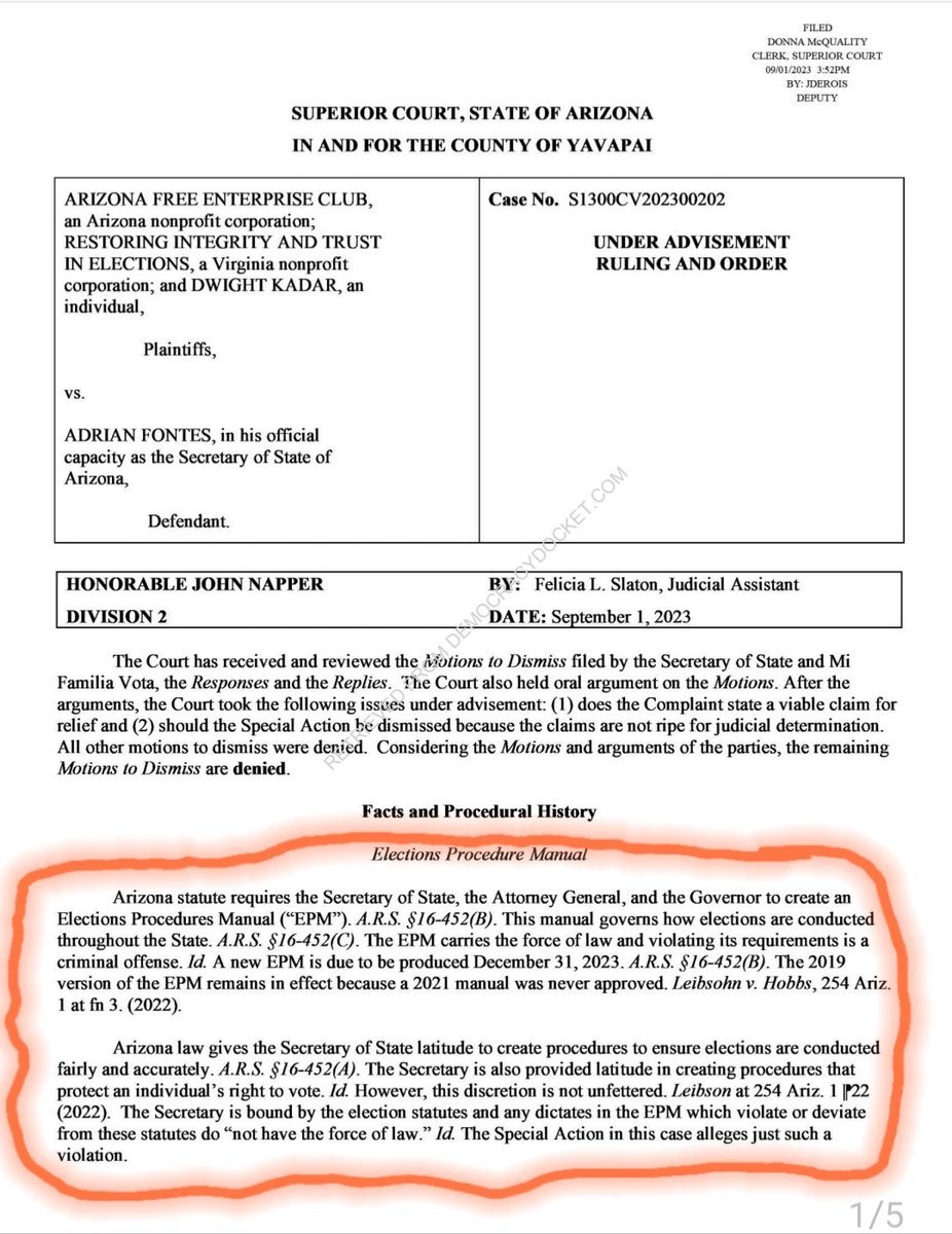 #BREAKING While not Spoken this Yavapai County Court's Order Shows that SOS @Adrian_Fontes Violated AZ Law as Maricopa County Recorder During the 2020 Election. MC Recorder @stephen_richer Also Violated Those Same Laws in 2022. The complaint below alleges the current EPM contains a definition of "registration record" which deviates significantly from the statute. The court finds that the Plaintiffs have have correctly defined registration record. The 2019 EPM and the instruction from the Secretary do "not have the force of law." This is the remedy sought in the Special Action. Accordingly, the SOS's Motion to Dismiss is denied. #Arizona Attorney General @krismayes please investigate #VoterIdentityTheft
