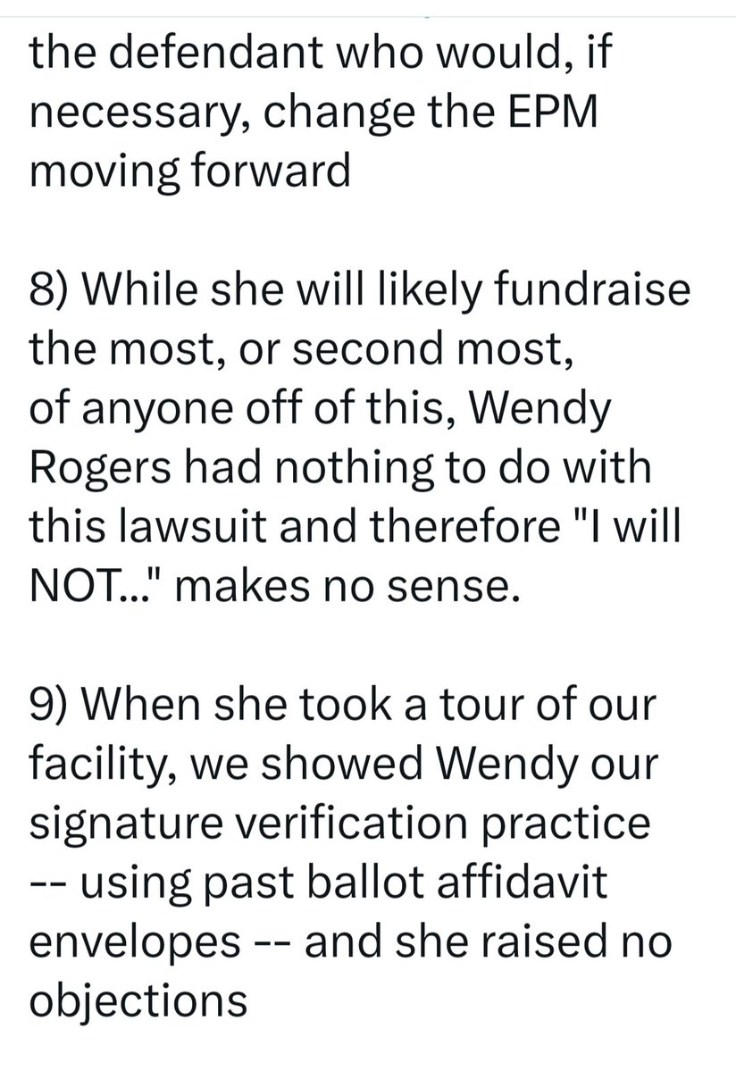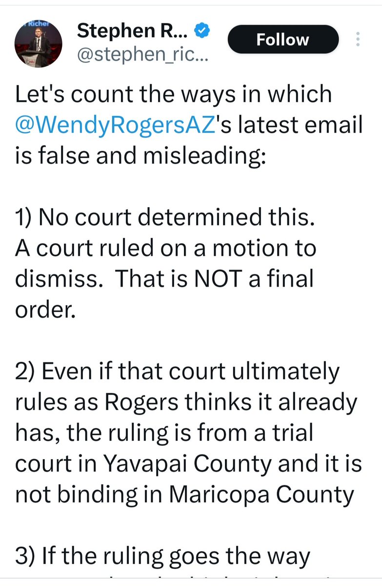 #ARIZONA NEWS: MaRICOpa County Recorder @stephen_richer Defends his Breaking the Law in his Statements below to Arizona Senator @WendyRogersAZ . If the Yavapai County Judge's Ruling Means Nothing then why has SOS Adrian Fontes Filed a Motion to Withdraw From the Upcoming Court Case; Lake v Richer Signature Verification Trial Sept 21? Attorney Stephen Richer just because you believe everyone else is breaking a law doesn't excuse your actions. If anything your statements indicate a possible widespread conspiracy to commit wrongdoing. @Restoring_USA @KariLake @BlehmLawAZ @Rach_IC @AbrahamHamadeh @WethePeopleAZA1 @DrJohnEastman @DC_Draino @ConradsonJordan @BehizyTweets @realDonaldTrump