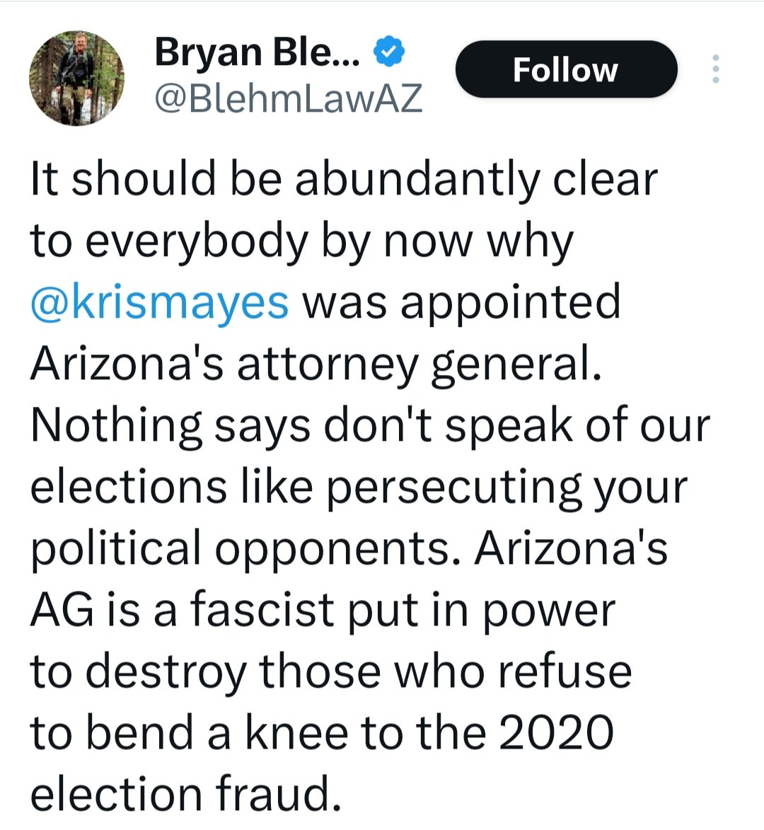 AZ Attorney General Kris "Mayes is using her power as attorney general to illegally influence the outcome of the primary elections so they get controllable rhinos elected. I think this in & of itself might violate Arizona law, namely ARS 16-192. But hey why waste power when you've got it." - @BlehmLawAZ Coshise County BOS's Who Refused to Certify the AZ 2022 Election are now illegally being Persecuted by AZ Attorney General Kris Mayes. @psjudd @WendyRogersAZ @Rach_IC @GeorgeNemeh @KariLake @AbrahamHamadeh @marceelias @DrJohnEastman @krismayes @realMikeLindell @KimWexlerMAJD @WethePeopleAZA1 @ConradsonJordan https://x.com/PPennypacker/status/1719585900857119113?s=20